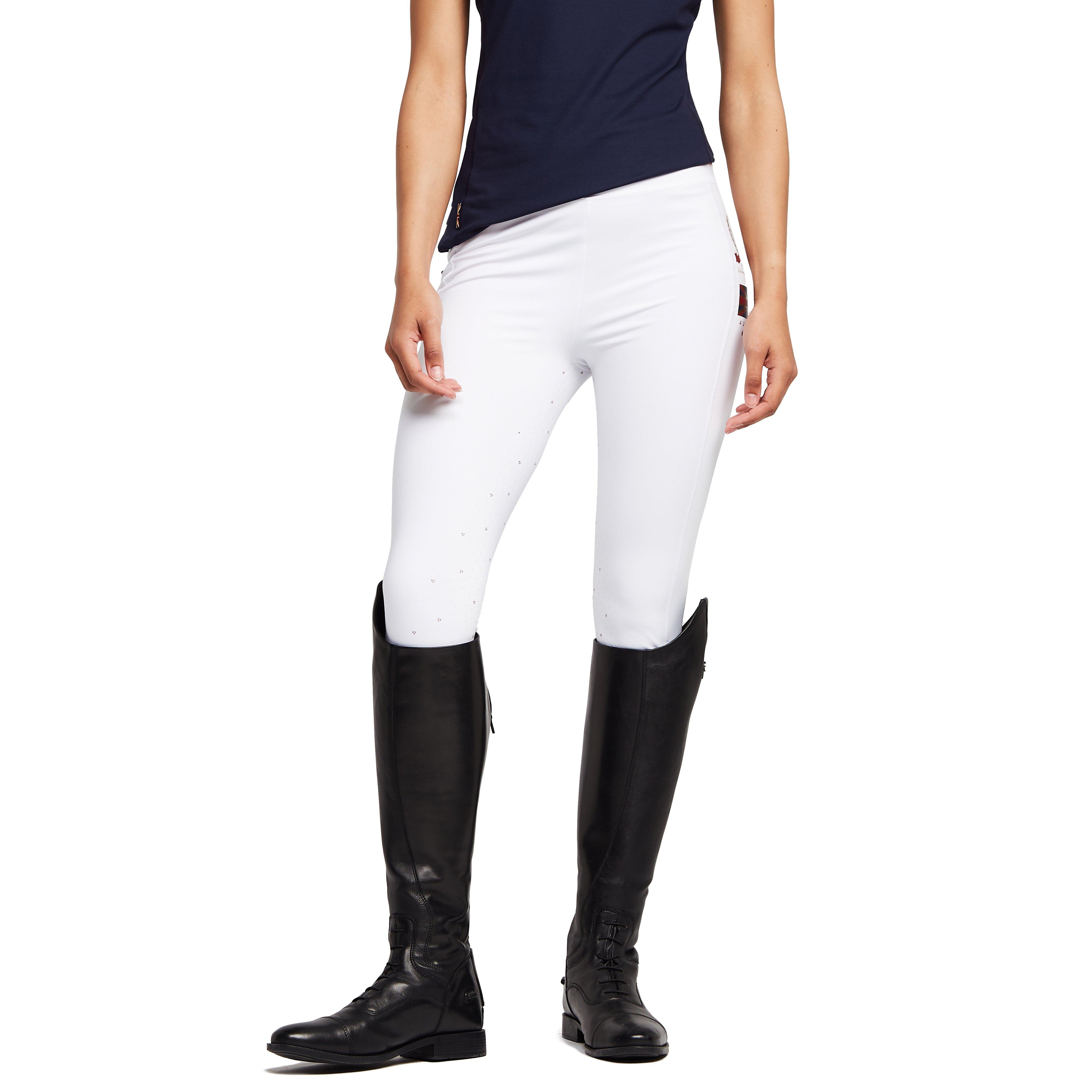 Aubrion Ladies Team Riding Tights White. Join the winning team with Aubrion Ladies Team Riding Tights. The Team Riding Tights combine both style and practicality, made from a technical performance fabric to keep you cool and comfortable all day long. Featuring a full seat and leg silicone grip for impeccable stability and security in the saddle no matter the weather. With a flattering, supportive waistband, thigh phone pocket, sleek dry cuffs and complete with the iconic #teamaubrion branding.