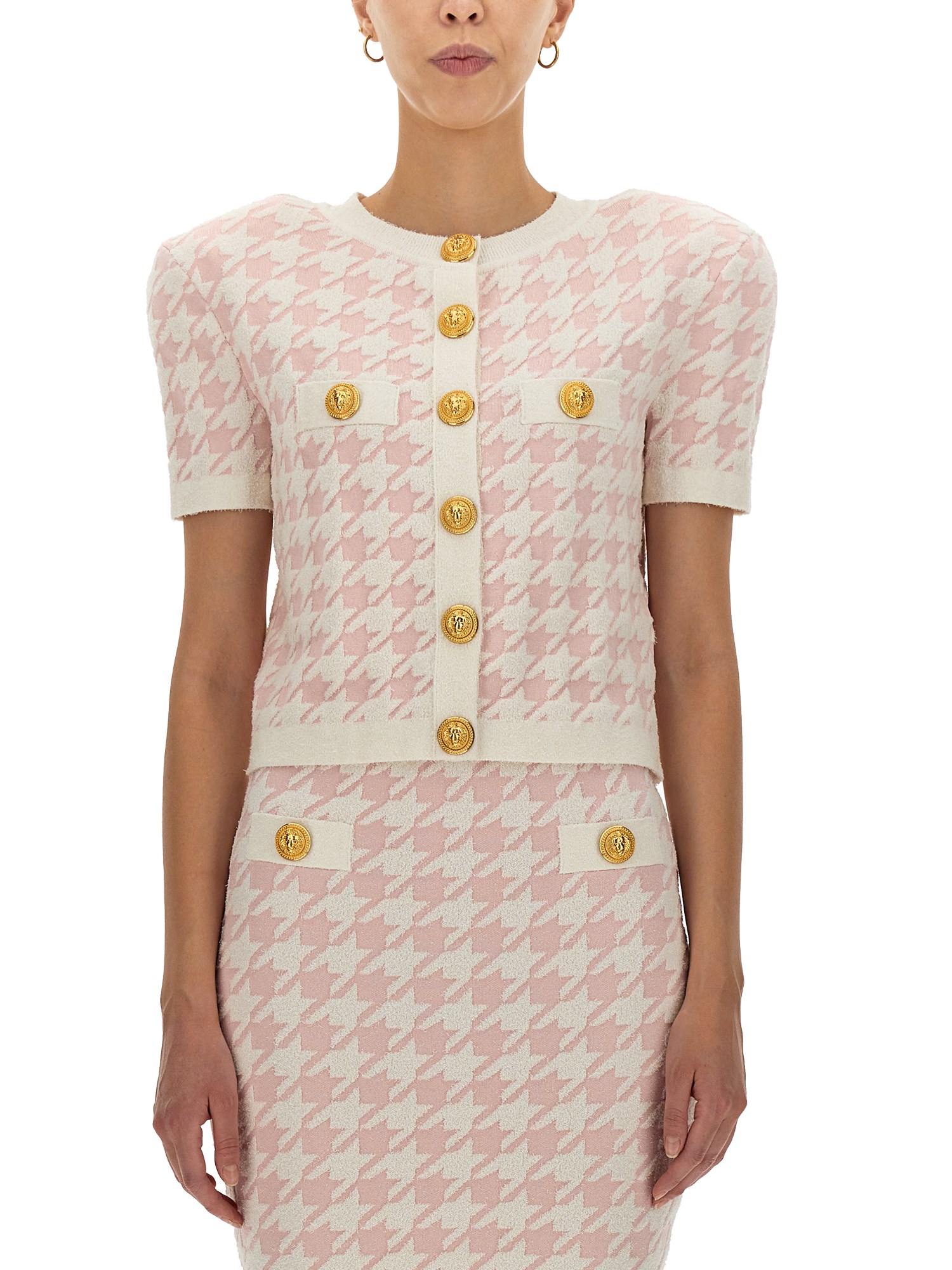 necklace front closure with gold embossed buttons padded shoulders 34% viscose 32% polyamide 26% cotton 7% polyester 1% elastane made in france the model is 180 cm tall and wears size 38