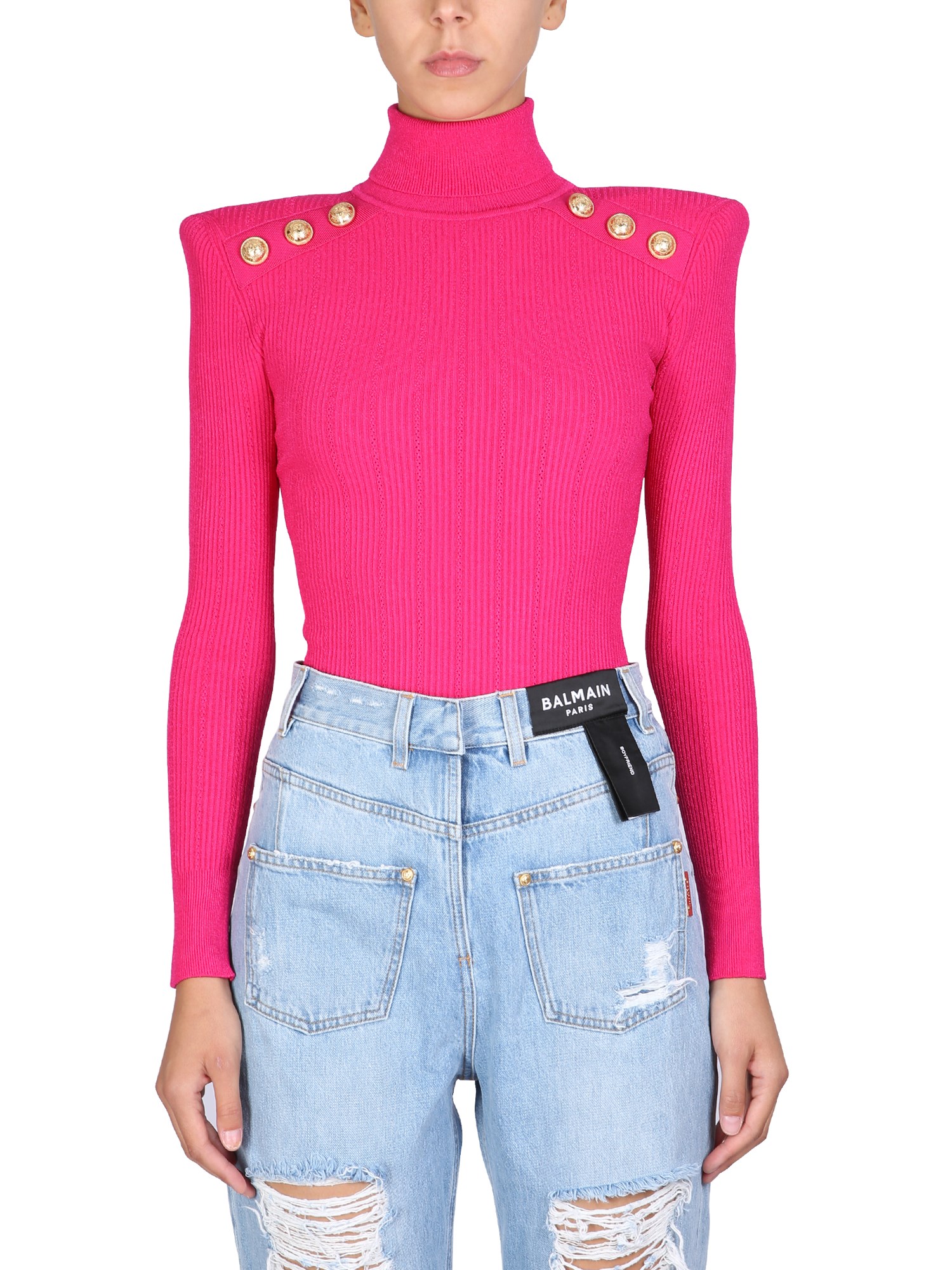 high neck structured shoulders ribbed knitting embossed buttons 83% viscose, 17% polyamide the model is 180 cm tall and wears size 38 fr