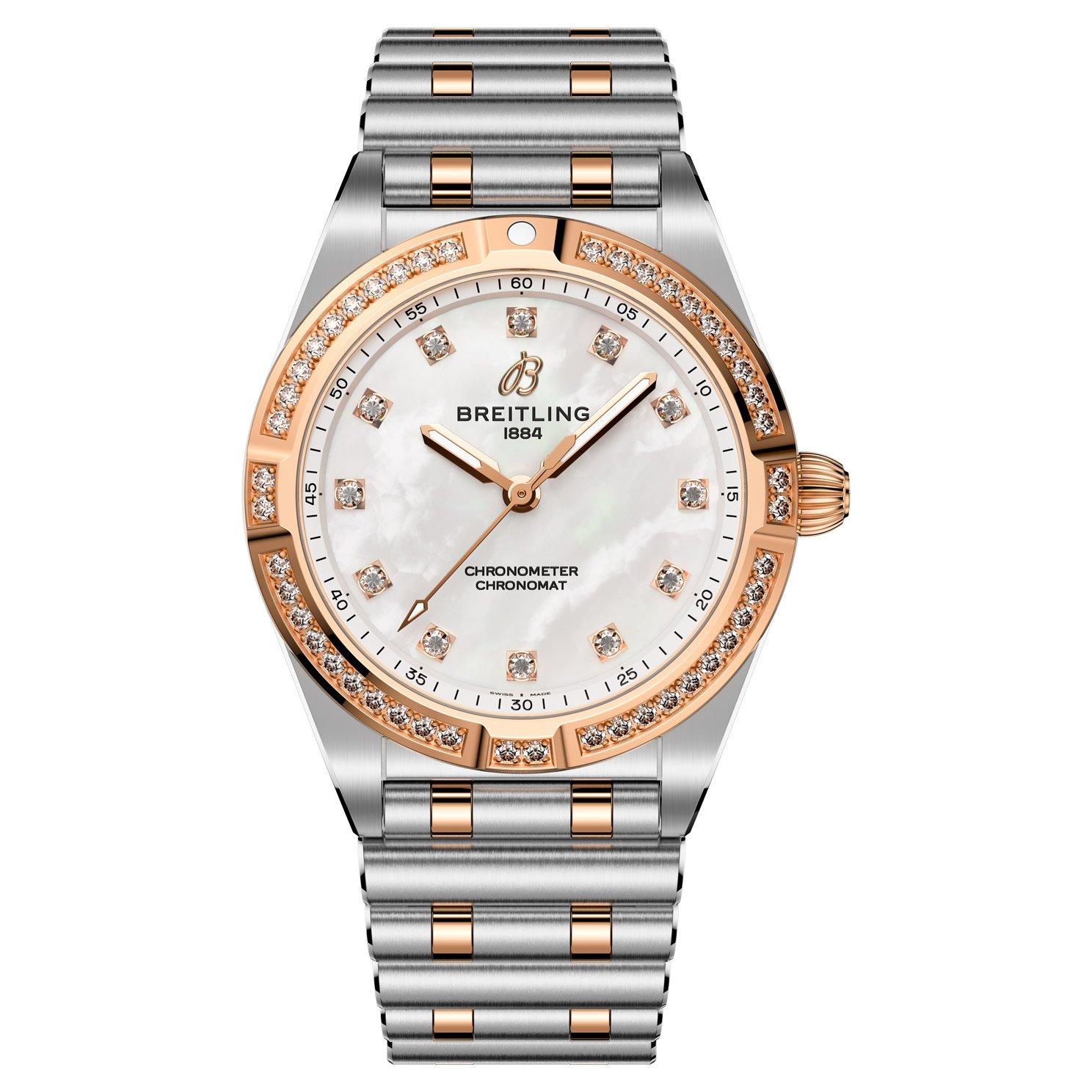 Specification: Breitling Chronomat 28mm Stainless Steel and 18ct Rose Gold Mother of Pearl Ladies Watch