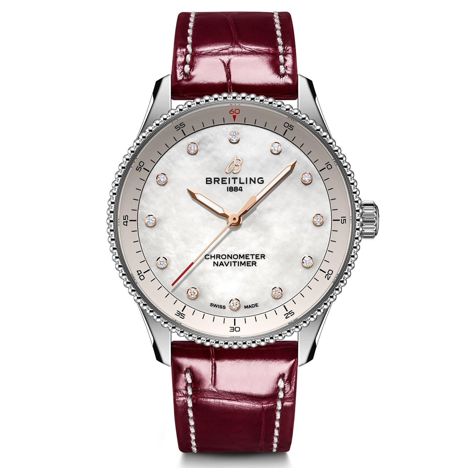 Showcasing iconic heritage and undeniably flawless style, this Breitling Navitimer 32 Diamond Mother of Pearl Leather Quartz Ladies Watch will elevate every look with a touch of timeless luxury. Styled with a red alligator leather strap, complemented with a classic white mother of pearl dial and lab grown diamond embellishment, this timepiece exudes sophisticated glamour in every detail. At A Glance Presented on an alligator leather strap and finished with a buckle 32mm case with 50m water resistance Classic white mother of pearl dial with stainless steel hands and lab grown diamond hour markers Sapphire crystal glass Powered by the Bretling Caliber 77, a supremely precise SuperQuartztm movement