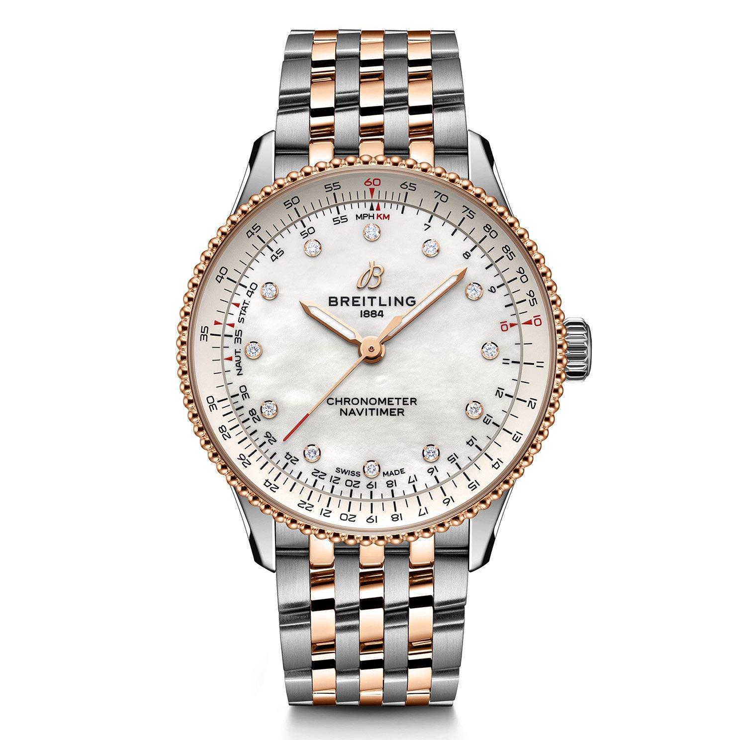 Combining the distinct features of an iconic timepiece with a glamourous essence, this Breitling Navitimer 36 18ct Rose Gold Diamond Mother of Pearl Automatic Ladies Watch showcases a contemporary design with timeless details. At A Glance Presented on an 18ct rose gold and stainless steel bracelet and finished with a foldover clasp 36mm case with 30m water resistance Classic white mother of pearl dial with 18ct rose gold hands and lab grown diamond hour markers Sapphire crystal glass Powered by the COSC-certified Breitling Caliber 17, providing three-hand time and automatic winding