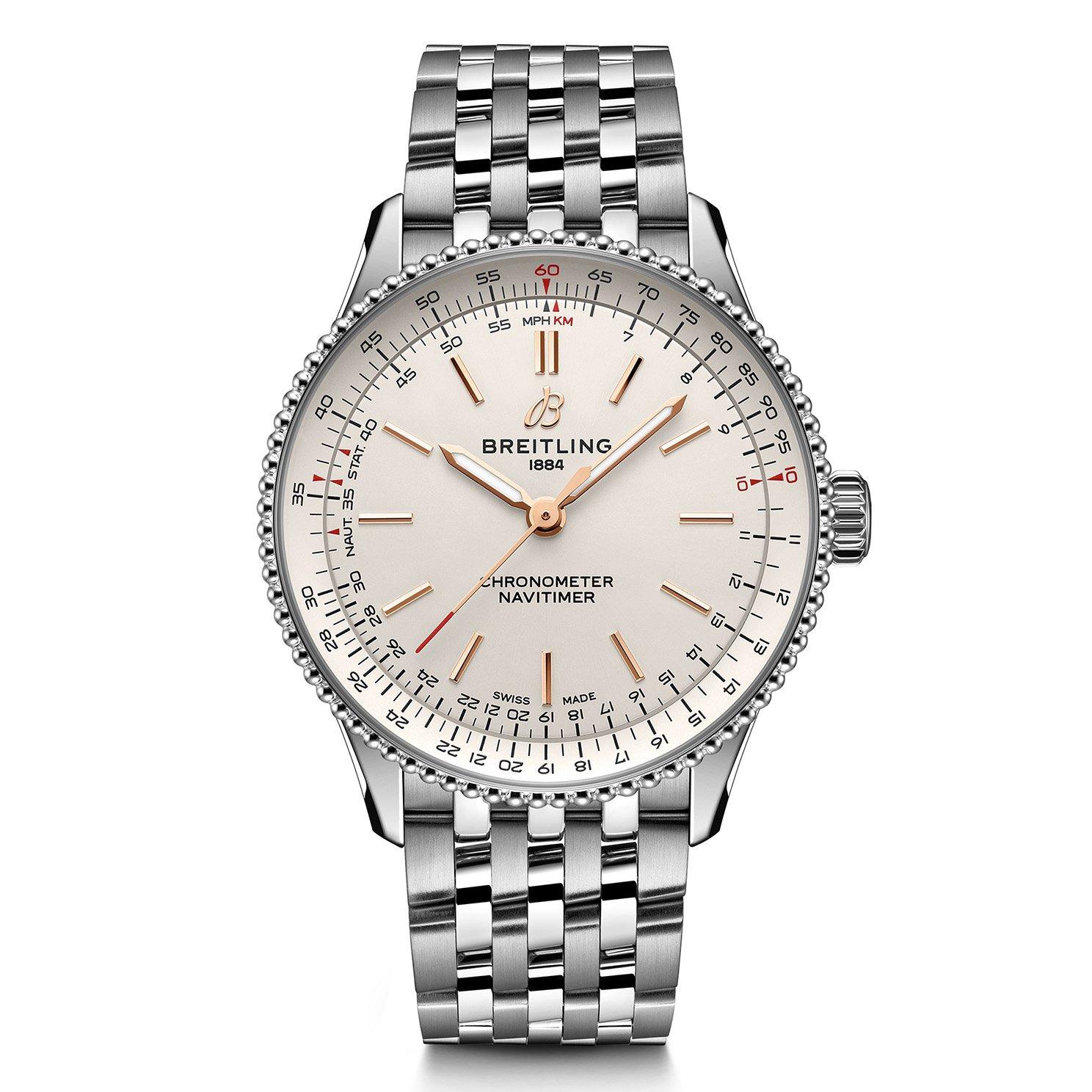 Luxurious style is paired with superior technology in this Breitling Navitimer 36 Stainless Steel Automatic Ladies Watch. Delivering the Navitimer’s unmistakable appearance enhanced with a chic silver dial to showcase a versatile elegance that’s ready for life’s adventures. At A Glance Presented on a stainless steel bracelet and finished with a foldover clasp 36mm case with 30m water resistance Silver dial with stainless steel hands and hour markers Sapphire crystal glass Powered by the COSC-certified Breitling Caliber 17, providing three-hand time and automatic winding