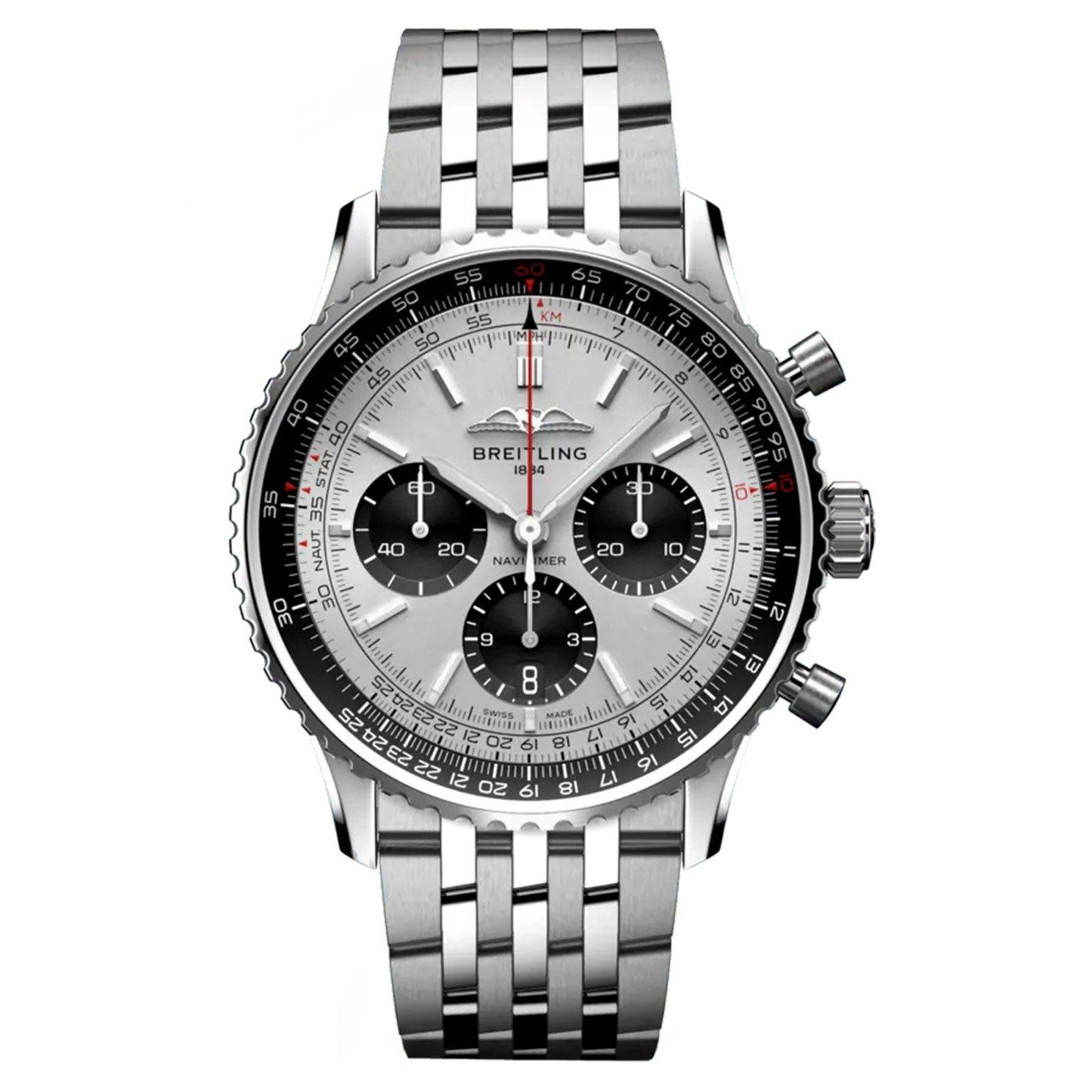 Experience iconic legacy and exceptional craftmanship with this Breitling Navitimer B01 Chronograph 43 Automatic Men’s Watch. Where precision meets sophistication, this timepiece seamlessly blends heritage design with cutting-edge technology, embodying the spirit of aviation pioneers in every detail. At A Glance Presented on a stainless steel bracelet and fastened with a double foldover clasp with push button 43mm stainless steel case with 30m water resistance Silver dial with the AOPA wings positioned at 12 o’clock, stainless steel hands and hour markers Cambered sapphire crystal glass, glareproofed both sides Date window displayed 6 o’clock Powered by Breitling 01, self-winding mechanical movement Power reserve of approximately 70 hours
