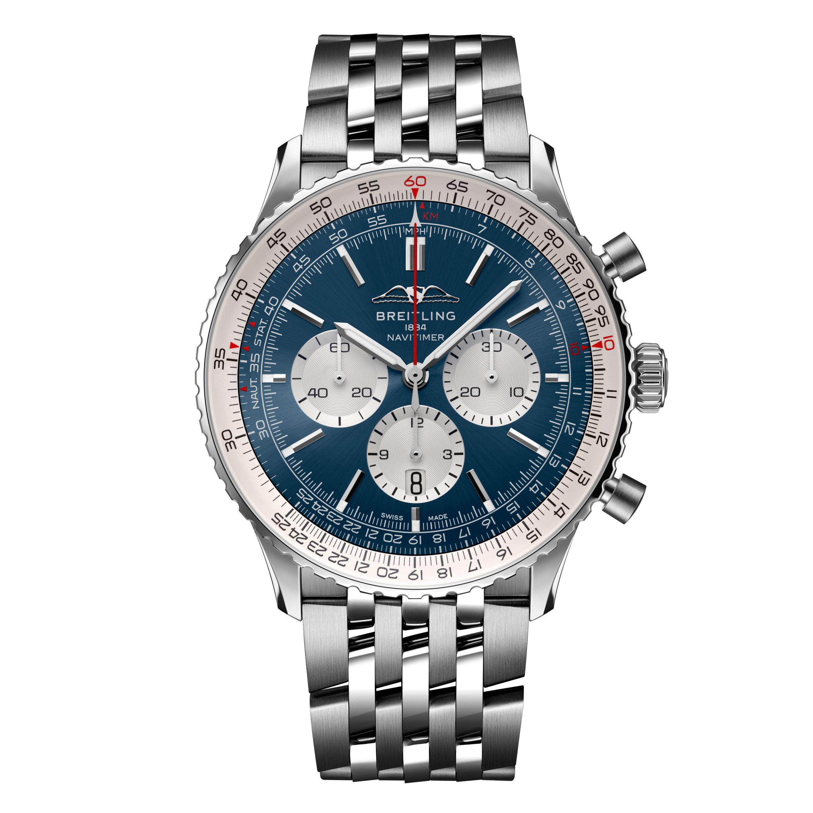 This Breitling Navitimer B01 Chronograpgh 46 Men’s Watch has been redesigned with enhanced styling and bold colour to celebrate the brands iconic collection turning 70 years old. It is a real tribute to the incredible journey this original pilot’s timepiece has taken, what began as a tool for pilots is now rightly described as one of the greatest watches of all time. Steeped in history, designed with the classic features of the original only elevated to include all the modern refinements that are needed, whether you are soaring through the sky, hitting the basketball court or dancing your way through the world of ballet. Presented on a stainless steel 7 row Navitimer bracelet with butterfly clasp 46mm stainless steel case with a water resistance of 30m Bidirectional bezel with circular slider rule Blue dial with contrasting chronograph counters Super-LumiNova® luminescent indexes, hour and minute hands Cambered sapphire crystal glass with glare-proof treatment both sides Powered by a self-winding mechanical movement 70-hour power reserve