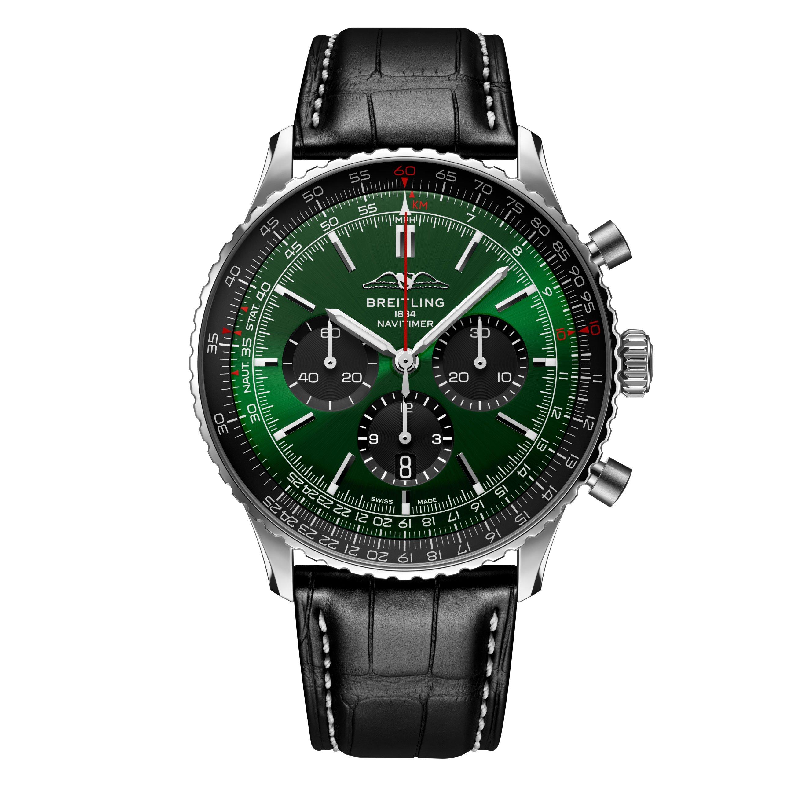 This Breitling Navitimer B01 Chronograpgh 46 Men’s Watch has been redesigned with enhanced styling and bold colour to celebrate the brands iconic collection turning 70 years old. It began life as a tool for pilots, and what an incredible journey this original pilot’s timepiece has taken, as it is now rightly described as one of the greatest watches of all time. Steeped in history, designed with the classic features of the original only elevated to include all the modern refinements that are needed, whether you are soaring through the sky, hitting the basketball court or performing your way through the world of ballet. Presented on a black alligator leather strap with white stitching detail and folding buckle 46mm stainless steel case with a water resistance of 30m Bidirectional bezel with circular slider rule Green dial with contrasting chronograph counters Super-LumiNova® luminescent indexes, hour and minute hands Cambered sapphire crystal glass with glare-proof treatment both sides Powered by a self-winding mechanical movement 70-hour power reserve