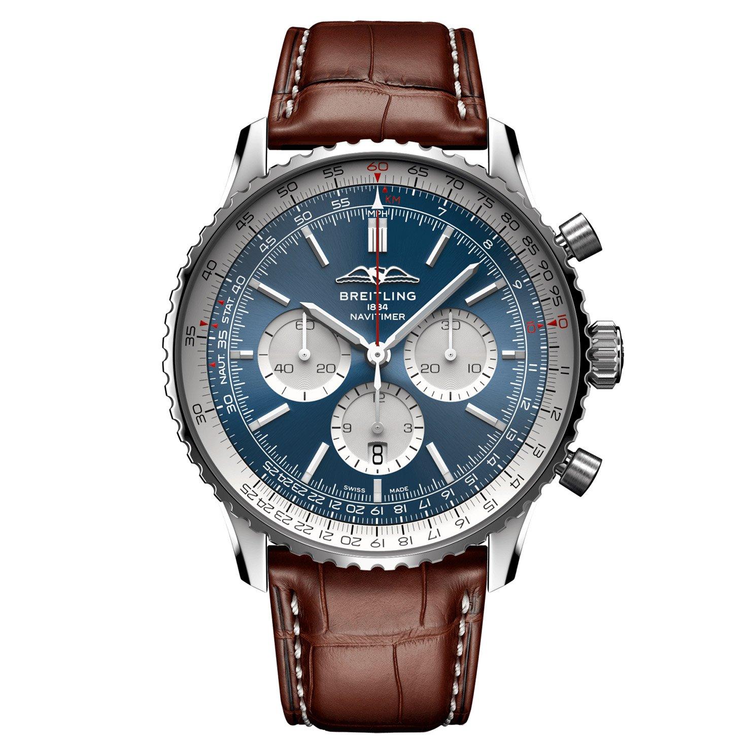 Worn by airline captains and aircraft enthusiasts, the Navitimer is an aviation icon. Designed to meet the needs of pilots and timepiece connoisseurs, this Breitling Navitimer B01 Chronograph 46mm Automatic Men’s Watch inherits the classic features of the original whilst introducing a modern flair to the collection. At A Glance Presented on a brown alligator leather strap and fastened with a stainless steel folding clasp 46mm stainless steel case with 30m water resistance Blue dial with the AOPA wings positioned at 12 o’clock, stainless steel hands and hour markers Sapphire crystal glass Date window displayed at 6 o’clock Powered by Breitling 01, self-winding mechanical movement Power reserve of approximately 70 hours