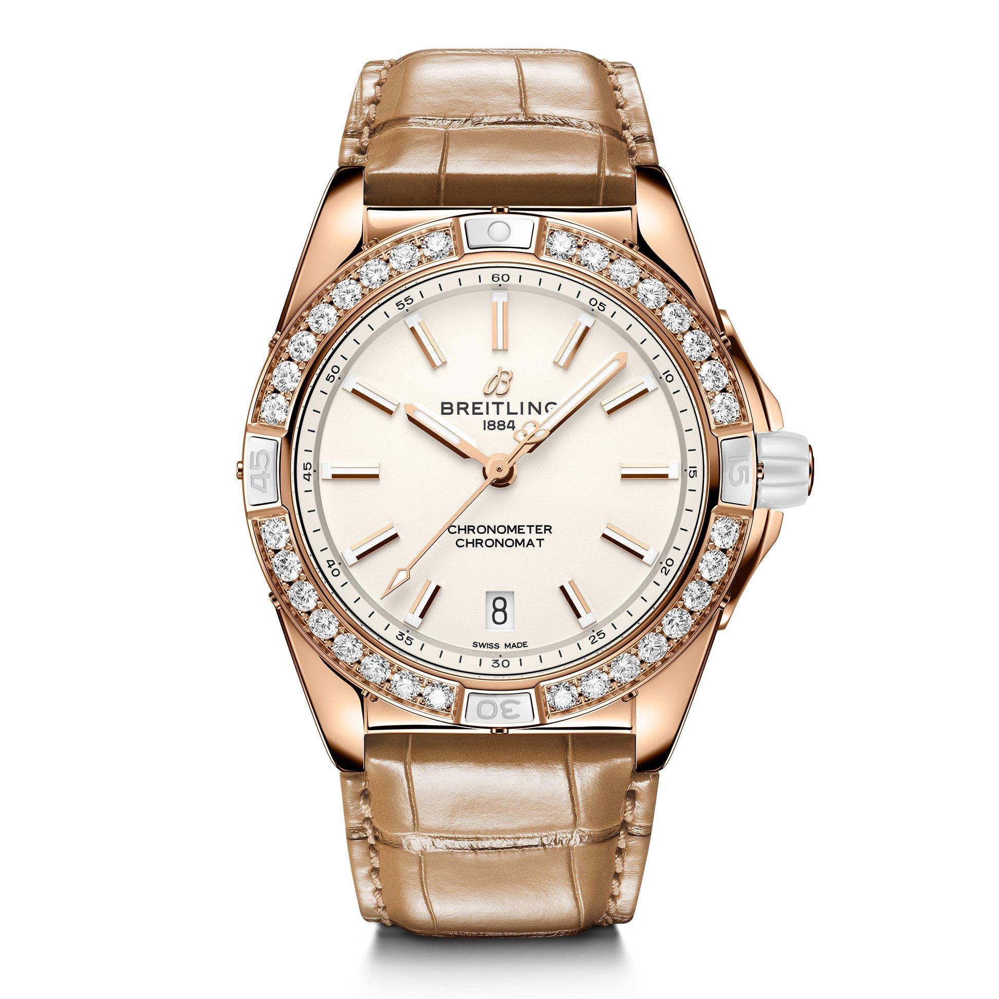 Effortlessly combining elegance with luxury, this Breitling Super Chronomat 38 18ct Rose Gold Diamond Automatic Ladies Watch is the epitome of sophistication. No matter what the occasion, this versatile timepiece features a stunning diamond bezel and bold rose gold detailing, that will ensure all eyes are on you. At A Glance Presented on a leather alligator strap fastened with a fold-over clasp 38mm rose gold case with 100m water resistance Silver dial with rose gold hands and indexes Lab-grown rose gold diamond bezel Scratch resistant sapphire crystal glass Date window at 6 o’clock Powered by a mechanical movement