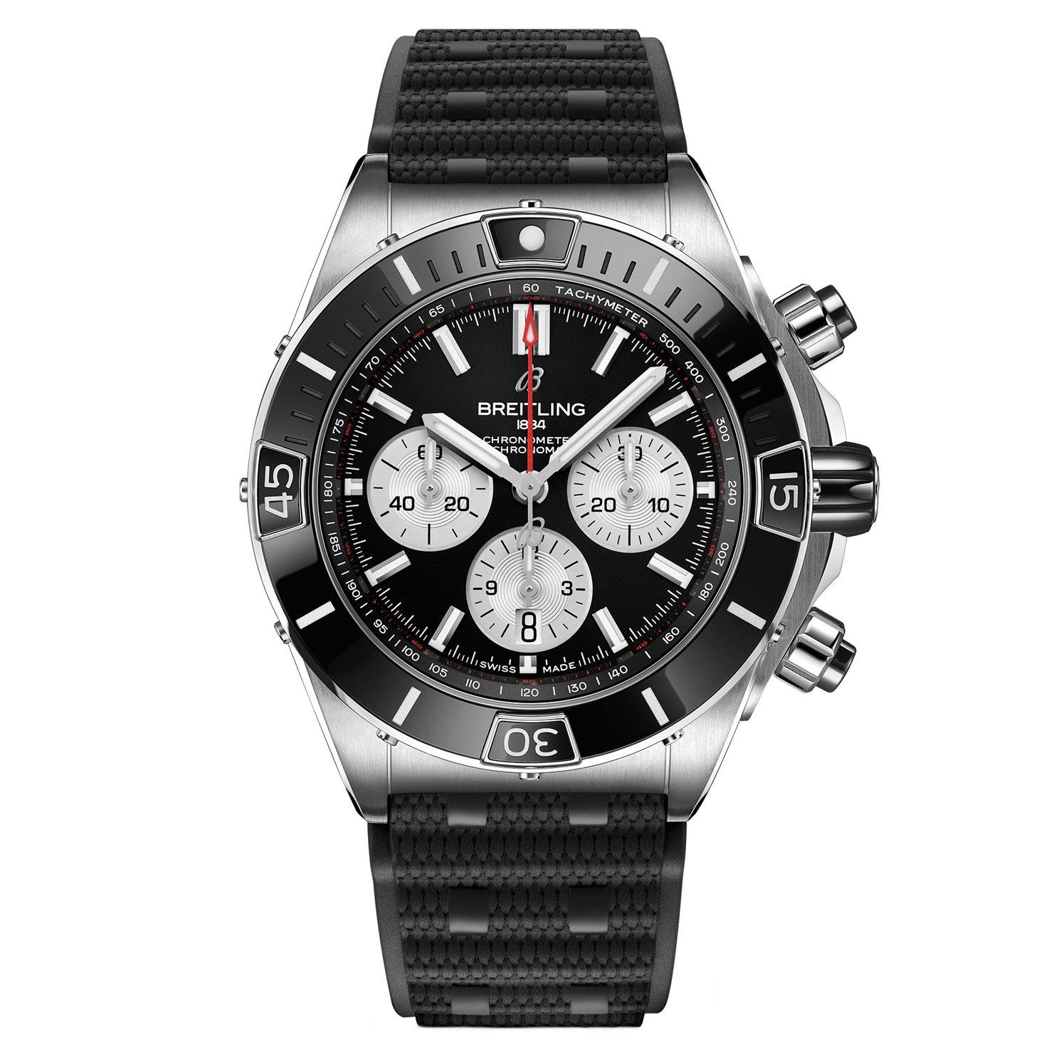 The brand’s boldest Chronomat to date, the new Breitling Super Chronomat B01 44 Automatic Men’s Watch is the ultimate choice for those who want a timepiece mastering the balance between sturdy and stylish. At A Glance Presented on a black rubber Rouleaux style strap and butterfly clasp 44mm case size with 200m water resistance Black dial with silver contrasting chronograph counters Super-LumiNova luminescent indexes and hands Stainless steel bezel with black ceramic insert, unidirectional ratcheted, indexes and Super-LumiNova coated rider tab numerals Screwed steel case back, with sapphire crystal Screw-locked crown with two gaskets Cambered sapphire, glareproofed on both sides Powered by the Breitling Manufacture Calibre 01 self-winding mechanical movement, bidirectional with ball bearing COSC-certified Power reserve of 70 hours