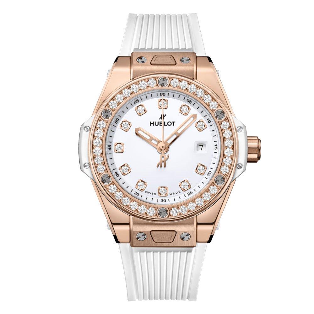 Demand attention with this striking and unique King Gold case and diamond encrusted bezel, the perfect blend of luxury and innovation. A timepiece that is sophisticated and always unexpected, this Hublot 18ct King Gold Big Bang One Click Diamond Ladies Watch breaks free from convention. Presented on a white structured lined rubber strap with a 18ct King Gold and titanium deployant buckle clasp 33mm satin-finished and polished 18ct King Gold case with a water resistance of 100m Polished 18ct King Gold bezel set with 36 diamonds Polished white dial set with 11 diamonds Super-LumiNovaR luminescent hour and minute hands Sapphire crystal glass with anti-reflective treatment Powered by a HUB1120 self-winding mechanical movement 40-hour power reserve 47 diamonds totalling 0.94ct weight Please note there could be a 5% variance on the diamond carat weight, as every diamond is unique Warranty certificates and instruction booklets for Hublot watches are available online through the Hublot e-warranty system