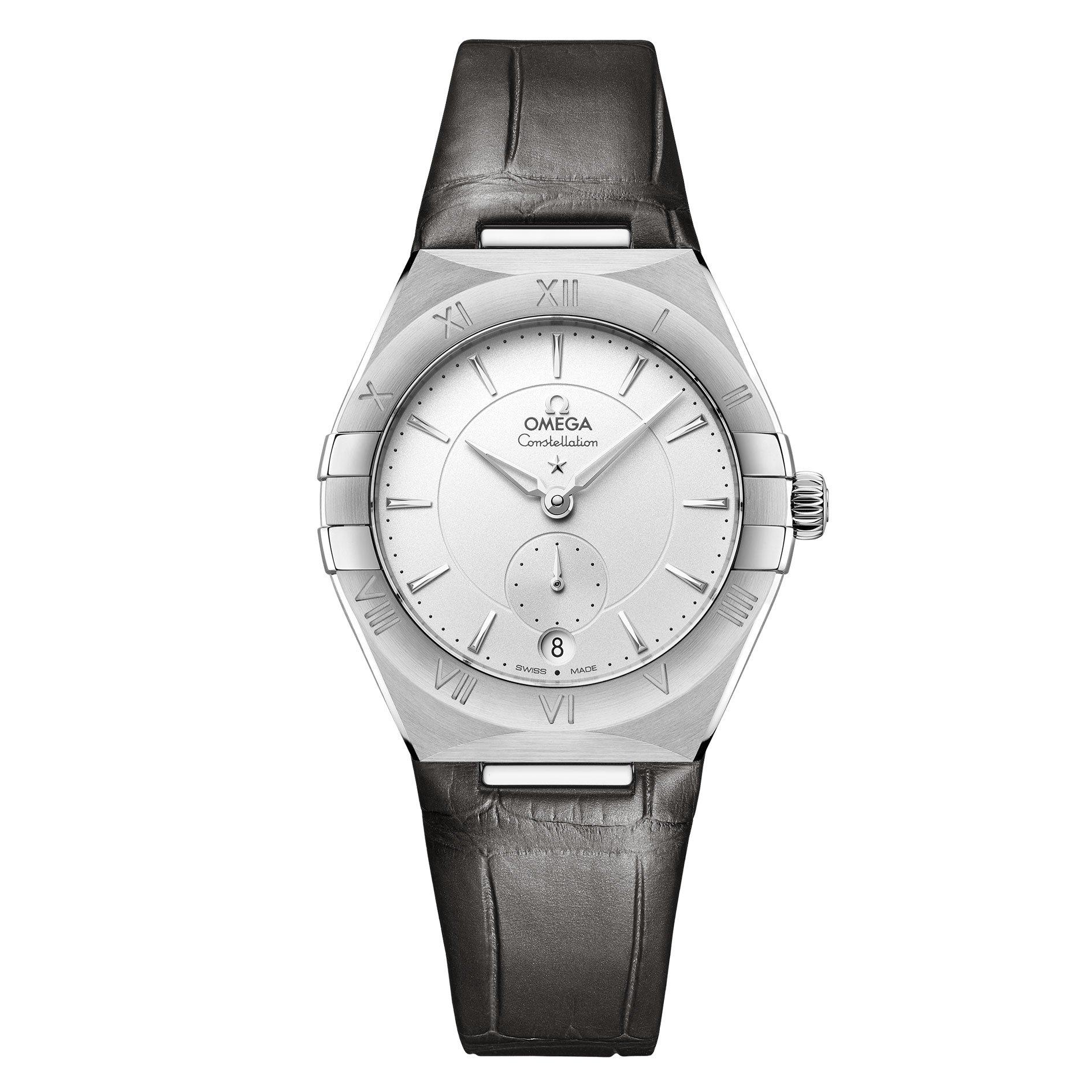 The OMEGA Constellation Automatic Ladies Watch is characterised by its famous half-moon facets and “claws” that curve around the case giving it a dramatic appearance with a design built to last. At A Glance Presented on a grey leather strap34mm stainless steel case and a bezel with engraved Roman NumeralsThe polished hour markers, hands, OMEGA logo and Constellation star are all in 18K white goldSmall seconds sub dial and central minute track are circled by ringsTransparent back caseDomed scratch-resistant sapphire crystalWater resistance up to 50mThe timepiece is powered by the OMEGA Co-Axial Master Chronometer Calibre 8802 with a power reserve of 55 hours