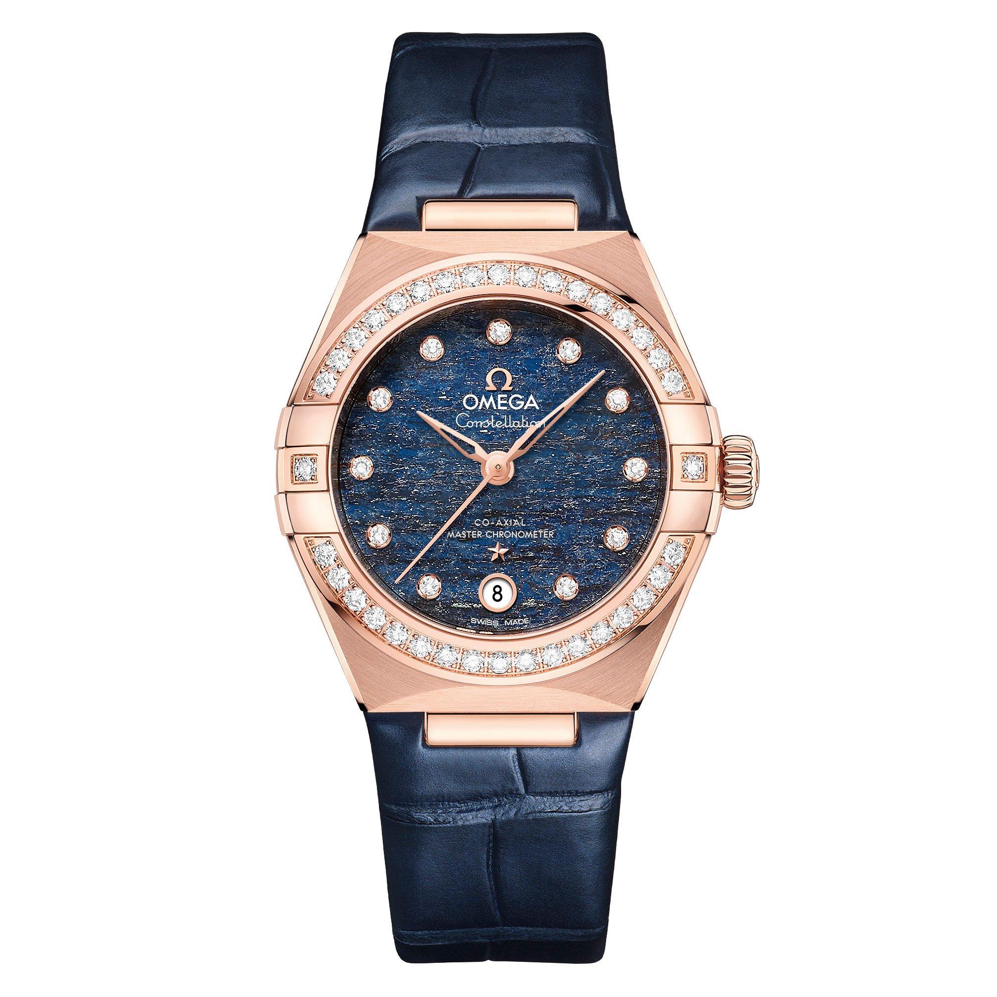 The bold blue Aventurine stone dial is beautifully complimented by the matching colour of the shimmering leather strap. The daring and dramatic design of this OMEGA Constellation Co-Axial Master Chronometer 18K Sedna Gold Ladies Watch, with the added shimmer of the diamond set bezel is utterly breath-taking. Harnessing gorgeous hues of 18K Sedna gold, the iconic features of half-moon facets and claws and diamond dot markers, this is a classic timepiece with a luxurious twist. Presented on a blue leather strap with pin buckle 29mm 18K Sedna gold and steel case with a water resistance of 50m 18K Sedna gold diamond paved bezel Blue Aventurine stone dial with diamond dot markers and 18K Sedna gold hands Date window positioned 6 o’clock Domed sapphire crystal glass with anti-reflective treatment on both sides Diamond clarity – VVS1 Total diamond carat weight – 0.64ct Powered by Self-winding movement with Co-Axial escapement, Certified Master Chronometer, approved by METAS, resistant to magnetic fields reaching 15,000 gauss Please note there could be a 5% variance on the diamond carat weight, as every diamond is unique