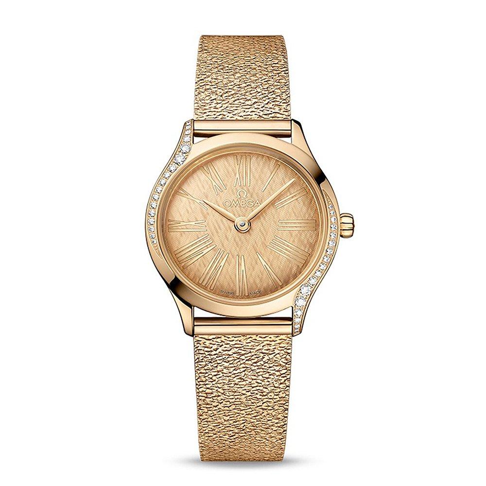 Combining meticulous attention to detail with 18ct Moonshine™ gold to catch the eyes of everyone in the room, this Omega De Ville Mini Tresor Quartz Ladies Watch is compact and a offers a truly dynamic style. At A Glance Presented on a Moonshine™ gold mesh bracelet 26mm Moonshine™ gold case with a 30m water resistance Gold enamel dial with Moonshine™ gold hands and Roman numeral hour markers Bezel embellished with diamonds Domed scratch resistant sapphire crystal glass with anti-reflective coating on the inside Powered by OMEGA Calibre 4061 movement Battery life up to 48 months