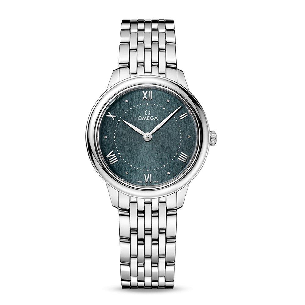 Show up in sumptuous style with this Omega De Ville Prestige Stainless Steel Green Quartz Ladies Watch, designed with an alluring patterned pine green dial and meticulous attention to detail, ensuring all eyes are always on you. At A Glance Presented on a stainless steel bracelet fastened with a butterfly clasp 30mm stainless steel case with a 30m water resistance Pine green dial with stainless steel hands and Roman numeral hour markers Stainless steel bezel Scratch resistant sapphire crystal glass Powered by a Quartz movement