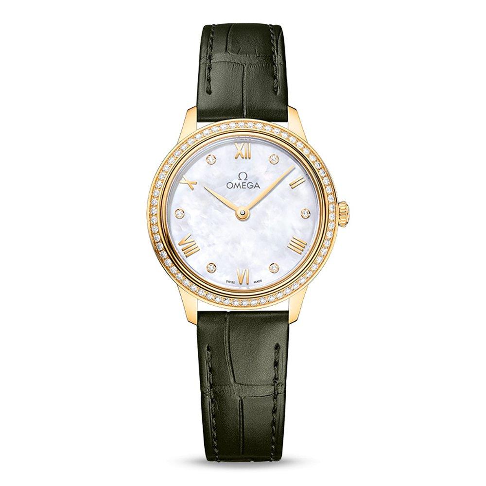 Offering the timeless elegance that the De Ville collection is well-loved for, this OMEGA De Ville Prestige Stainless Steel Mother of Pearl Diamond Quartz Ladies Watch showcases understated glamour with its diamond bezel and green leather alligator strap, along with unparalleled movement and precision. At A Glance Presented on a green leather alligator strap fastened with a pin buckle 27.5mm 18ct yellow gold case with a 30m water resistance 18ct yellow gold fixed diamond bezel Mother of pearl dial with 18ct yellow gold hands and Roman numeral diamond hour markers Scratch resistant sapphire crystal glass with anti-reflective treatment on the inside Powered by a quartz movement calibre 4061 Battery life – at least 48 months
