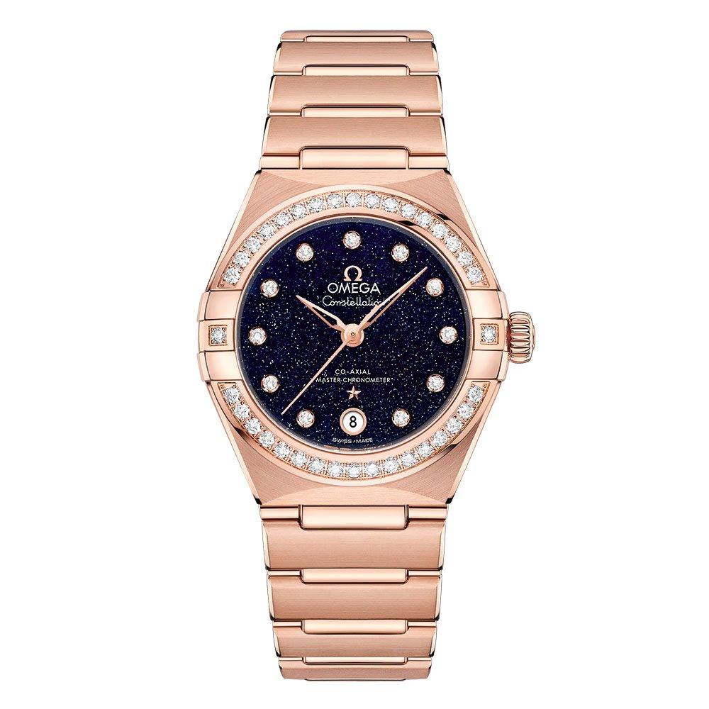 Add luxury to your wardrobe with this extraordinary OMEGA Constellation Manhattan 18ct Rose Gold Diamond Automatic Ladies Watch. Designed with a diamond set bezel for maximum output. At A Glance Presented on a 18ct rose gold mono-rang bracelet 29mm case size with 50m water resistance Blue adventuring glass dial with diamond dot hour markers and date window at 6 o’clock Scratch resistant sapphire crystal glass with anti-reflective treatment on both sides 18ct rose gold hands, OMEGA logo, Constellation star and diamond holders 18ct gold diamond set bezel Powered by the OMEGA co-axial master chronometer calibre 8701, visible through a transparent caseback Power reserve of 50 hours Please note there could be a 5% variance on the diamond carat weight, as every diamond is unique