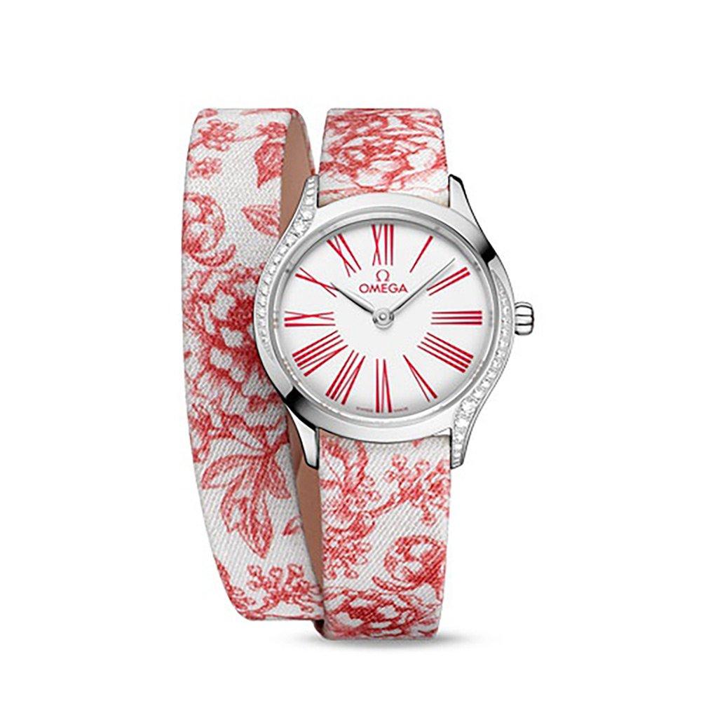 This Pre-Owned OMEGA De Ville Mini Tresor 26mm Diamond Ladies Watch features a unique Toile de Jouy ‘double tour’ fabric bracelet in an eye-capturing red floral design. At A Glance * Although the condition of our pre-owned watches meets our strict standards, please note this timepiece may have slight defects or imperfections* All our pre-owned watches have undergone a thorough health check to ensure they are in perfect working order* The authenticity of your pre-owned watch has also been verified and will be accompanied by a 2 year Beaverbrooks warranty. Should the timepiece obtain a manufacturer’s warranty for longer than 2 years, this will be honoured* The image shown is the original brand image* Scratch-resistant sapphire crystal glass with anti-reflective treatment inside* Powered by a Quartz movement calibre 4061