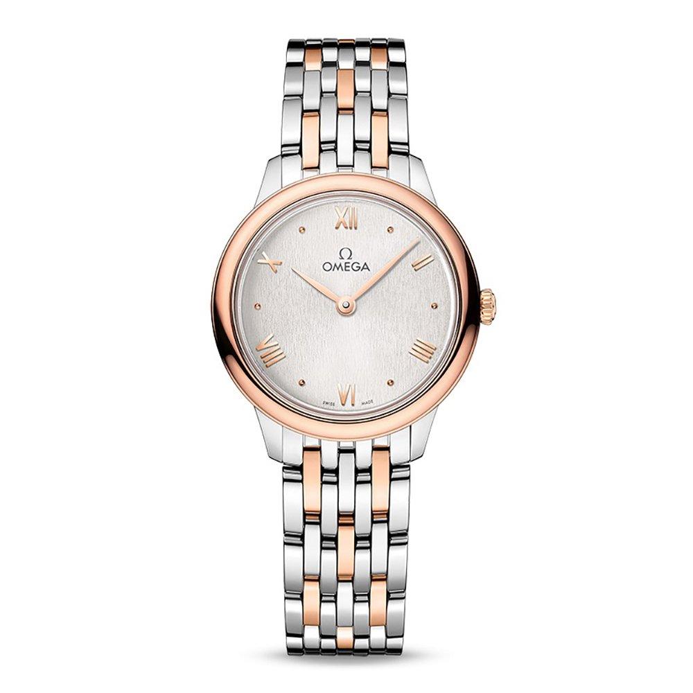 Declare your elegant sense of style with this outstanding Pre-Owned OMEGA De Ville Prestige 27.5mm Stainless Steel and Sedna Gold Ladies Watch. Designed with a contemporary stainless steel and Sednatm gold bracelet, an understated patterned dial and incredible watch making craftsmanship, this timepiece is undoubtably a must-have. At A Glance Presented on a stainless steel and Sednatm gold bracelet fastened with a butterfly clasp 27.5mm stainless steel and Sednatm gold case with a 30m water resistance Sednatm gold fixed bezel Silver stamped vertical patterned dial with Sednatm gold hands and roman numeral hour markers Scratch resistant sapphire crystal glass with anti-reflective treatment on the inside Powered by a quartz movement calibre 4061 Battery life – at least 48 months All our pre-owned watches have undergone a thorough health check to ensure they are in perfect working order Your pre-owned watch’s authenticity has also been independently verified, and will be accompanied by a 12-month Beaverbrooks warranty The condition of all our pre-owned watches meet our strict standards, however some imperfections may remain The image shown reflects the true condition of this timepiece