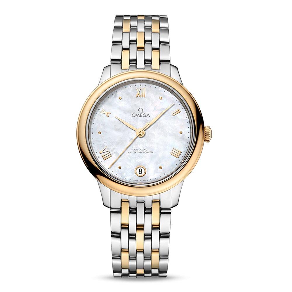 A timeless and adored collection that represents elegance and sophistication, this Pre-Owned OMEGA De Ville Prestige 34mm Stainless Steel and 18K Yellow Gold Ladies Watch perfectly represents the essence of the De Ville. Showcasing a lustrous mother of pearl dial adorned with classic yellow gold detailing, this timepiece is certainly a sumptuous addition to your watch collection. At A Glance Presented on a stainless steel and 18ct yellow gold bracelet fastened with a butterfly clasp 34mm bi-metal case with a 30m water resistance Mother of pearl dial with gold plated hands and Roman numeral hour markers Yellow gold bezel Scratch resistant sapphire crystal glass Date window at 6 o’clock Co-Axial master chronometer Powered by a self-winding automatic movement – calibre Omega 8800 Power reserve up to 55 hours All our pre-owned watches have undergone a thorough health check to ensure they are in perfect working order Your pre-owned watch’s authenticity has also been independently verified, and will be accompanied by a 12-month Beaverbrooks warranty The condition of all our pre-owned watches meet our strict standards, however some imperfections may remain The image shown reflects the true condition of this timepiece