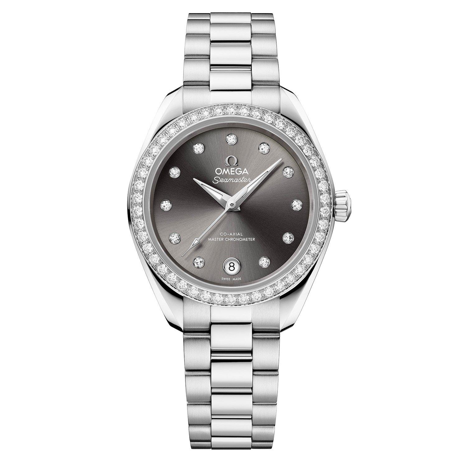 Gracefully blending everyday elegance with luxury detailing, this OMEGA Seamaster Aqua Terra 150M 30mm Diamond Automatic Ladies Watch offers a refined sparkle with every glance. At A Glance Presented on a stainless steel bracelet and fastened with a butterfly clasp with comfort setting 30mm stainless steel case with 150m water resistance Grey sun-brushed, PVD colour-treated and lacquered dial with 18K white gold redesigned faceted hands and 11 diamond hour markers, framed by a diamond bezel Domed scratch-resistant sapphire crystal glass with anti-reflective treatment on both sides Date window displayed at 6 o’clock Powered by OMEGA’s innovative Co-Axial Master Chronometer calibre 8750 48 hours power reserve