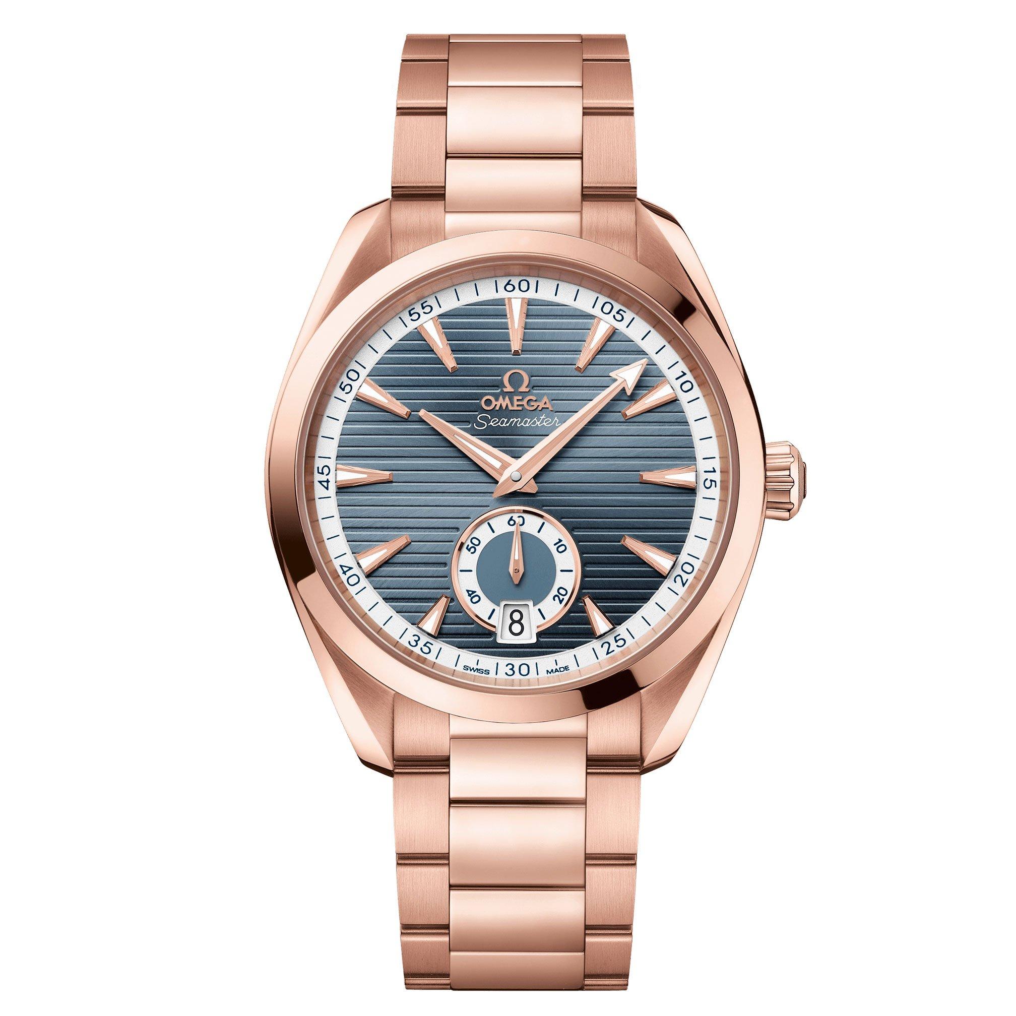 The OMEGA Seamaster Aqua Terra 150m 41mm 18K Sedna Gold Automatic Men’s Watch has undergone a stylish makeover, boasting a clean, simple, and balanced design making it a superb tribute to the brands rich maritime heritage. At A Glance Presented on a polished and brushed bracelet in rose gold tone41mm symmetrical case that has been crafted from 18K Sednatm gold, with a wave-edged design featured on the back18K Sednatm gold hands and indexes filled with white Super-LumiNovaTransparent case backScrew-in crownDomed scratch-resistant sapphire crystal with antireflective treatment on both sidesWater resistance up to 150mPowered by the OMEGA Master Chronometer calibre 8901, certified at the industry’s highest standard by the Swiss Federal Institute of Metrology (METAS)Power reserve up to 60 hours