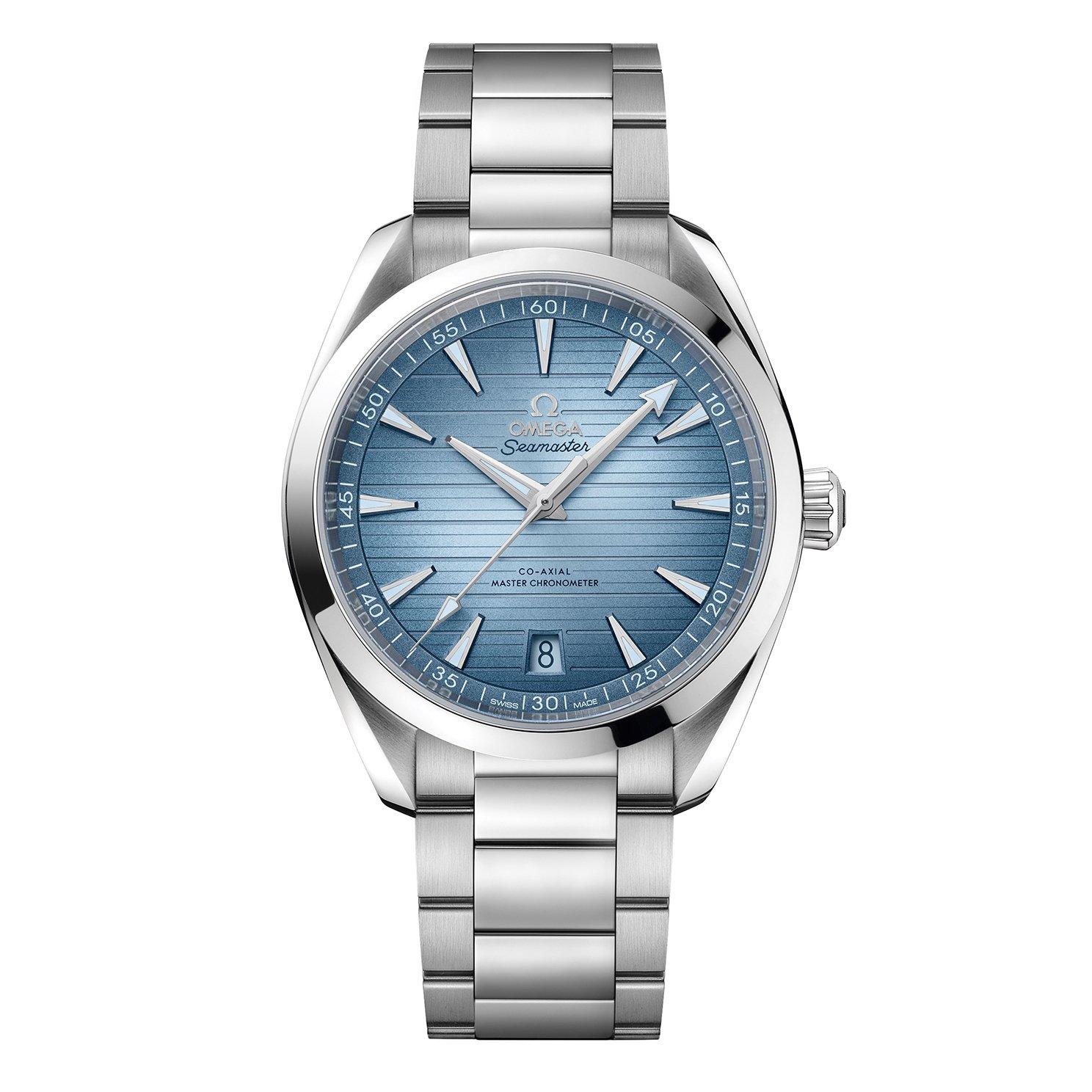 Perfect for days on deck, this OMEGA Seamaster Aqua Terra 150m Chronometer Automatic Men’s Watch boasts a classic minimal display with an impressive water resistance. Designed with a teak pattern dial enhanced with Super-LumiNova filled hands and hour markers and stamped with the commemorative Seamaster logo on the caseback, this timepiece is perfect for luxurious days on the deck. At A Glance Presented on a stainless steel bracelet and finished with a butterfly clasp 41mm case with 150m water resistance Teak pattern dial in Omega’s own Summer Blue with stainless steel hands and hour markers filled with blue Super-LumiNova Date window displayed at 6 o’clock Sapphire crystal glass Powered by an automatic movement