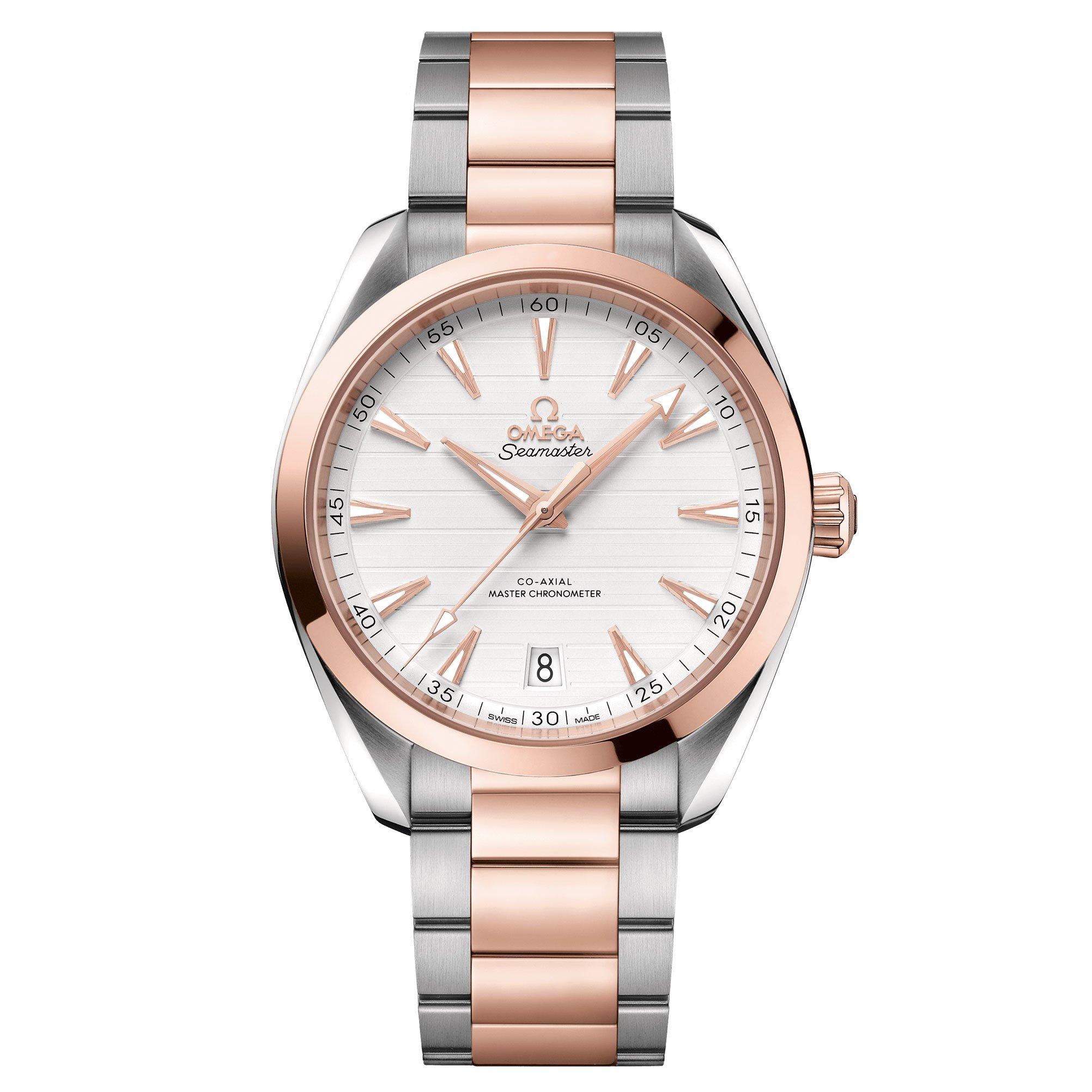 A tribute to the brand’s rich maritime heritage, this OMEGA Seamaster Aqua Terra Steel and 18ct Sedna Gold Automatic Men’s Watch has a horizontal “teak” pattern inspired by the wooden decks of luxury sailboats, a signature feature of the Seamaster AquaTerra. At A Glance Presented on a two tone stainless steel and 18ct Sedna gold bracelet 41mm case size with 150m water resistance Symmetrical polished-brushed case in stainless steel and 18ct Sedna gold, and a screw-in case back with a wave-edged design Silver sun-brushed dial with facetted hands in 18ct Sedna gold, filled with white Super-LumiNova Date window at 6 o’clock Domed scratch-resistant sapphire crystal with anti-reflective treatment on both sides Powered by OMEGA’s Master Chronometer calibre 8900 – certified at the industry’s highest level by the Swiss Federal Institute of Metrology (METAS) Power reserve of 60 hours