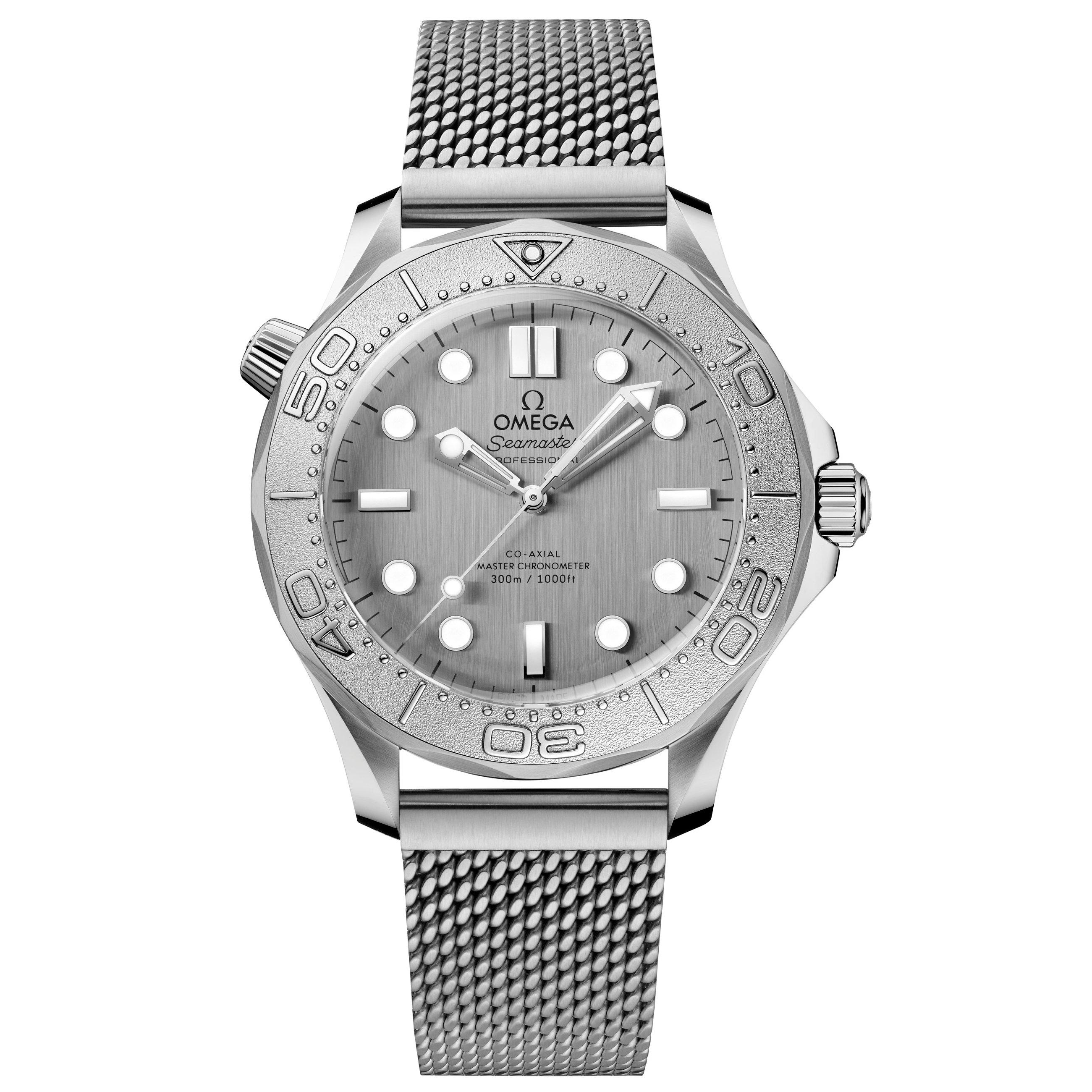 Keeping true to the brands maritime heritage and magnificent craftsmanship, this Omega Seamaster Diver 300M 42mm Titanium Co-Axial Master Chronometer Automatic Watch is a breath-taking fusion of contemporary design and ground-breaking movement. An incredible master chronometer certified movement is housed in a robust case, with a reliable grade 5 titanium rotating bezel and is all brought to life by its innovative character. At A Glance Presented on brushed mesh stainless steel bracelet fastened with a clasp 42mm stainless steel case with a 300m water resistance Grade 5 titanium bezel ring with a laser-ablated diving scale in positive relief and a single dot of Super-Luminova at 12 o’clock PVD stainless steel brushed dial with skeletonised hands and indexes both filled with Super-Luminova Scratch resistant sapphire crystal glass Co-Axial Master chronometer certified Powered by an automatic movement – calibre 8806 Power reserve up to 55 hours