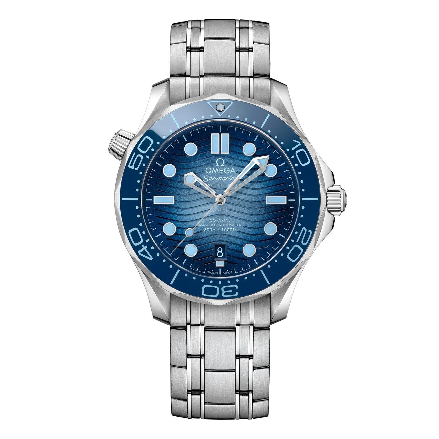 Delivering meticulous attention to detail, this OMEGA Seamaster Diver 300m Chronometer Automatic Men’s Watch boasts a stylish underwater companion. Embracing the famous ocean heritage, the Summer Blue wave-pattern ceramic dial provides the sense of depth. At A Glance Presented on a stainless steel bracelet and finished with a foldover clasp with comfort setting and diver extension 42mm case with 300m water resistance Ceramic dial in Omega’s own Summer Blue with skeleton hands and light blue hour markers Date window displayed at 6 o’clock Sapphire crystal glass Powered by an automatic movement