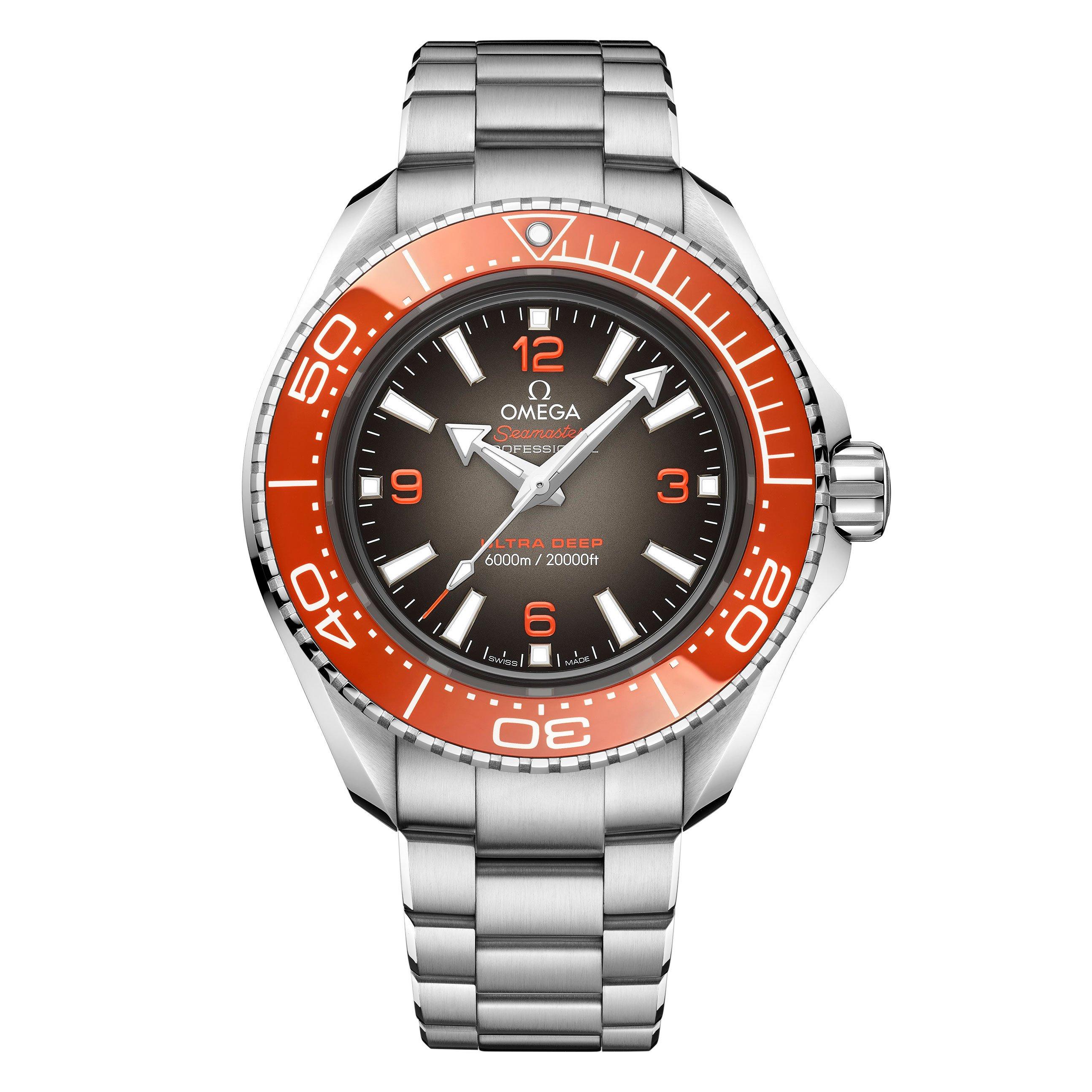 Part of a world-record dive in 2019, this OMEGA Seamaster Planet Ocean 6000m Ultra Deep Master Chronometer Men’s Watch has been tested in real ocean conditions during its development. The Ultra Deep made history when it reached the deepest place on Earth and meets the ISO 6425:2018 standard for saturation divers’ watches. At A Glance Set on an O-MEGASTEEL bracelet with OMEGA’s patented extendable fold over rack-and-pusher with complementary length adjustment and extra diver extension 45.5mm model in robust O-MEGASTEEL features a polished orange ceramic bezel with its diving scale in Liquidmetal™ Water resistant to 6,000 metres and meets the ISO 6425:2018 standard for saturation divers’ watches Lacquered gradient grey & black dial, 18ct white gold hands and hour markers, coated with white Super-LumiNova Domed, protuberant and scratch-resistant sapphire crystal with anti-reflective treatment on both sides On the case back’s Grade 5 titanium medallion, there is a laser-engraved Sonar emblem with the iconic OMEGA Seahorse at its centre Powered by the OMEGA Co-Axial Master Chronometer Calibre 8912 movement with up to 60 hours power reserve