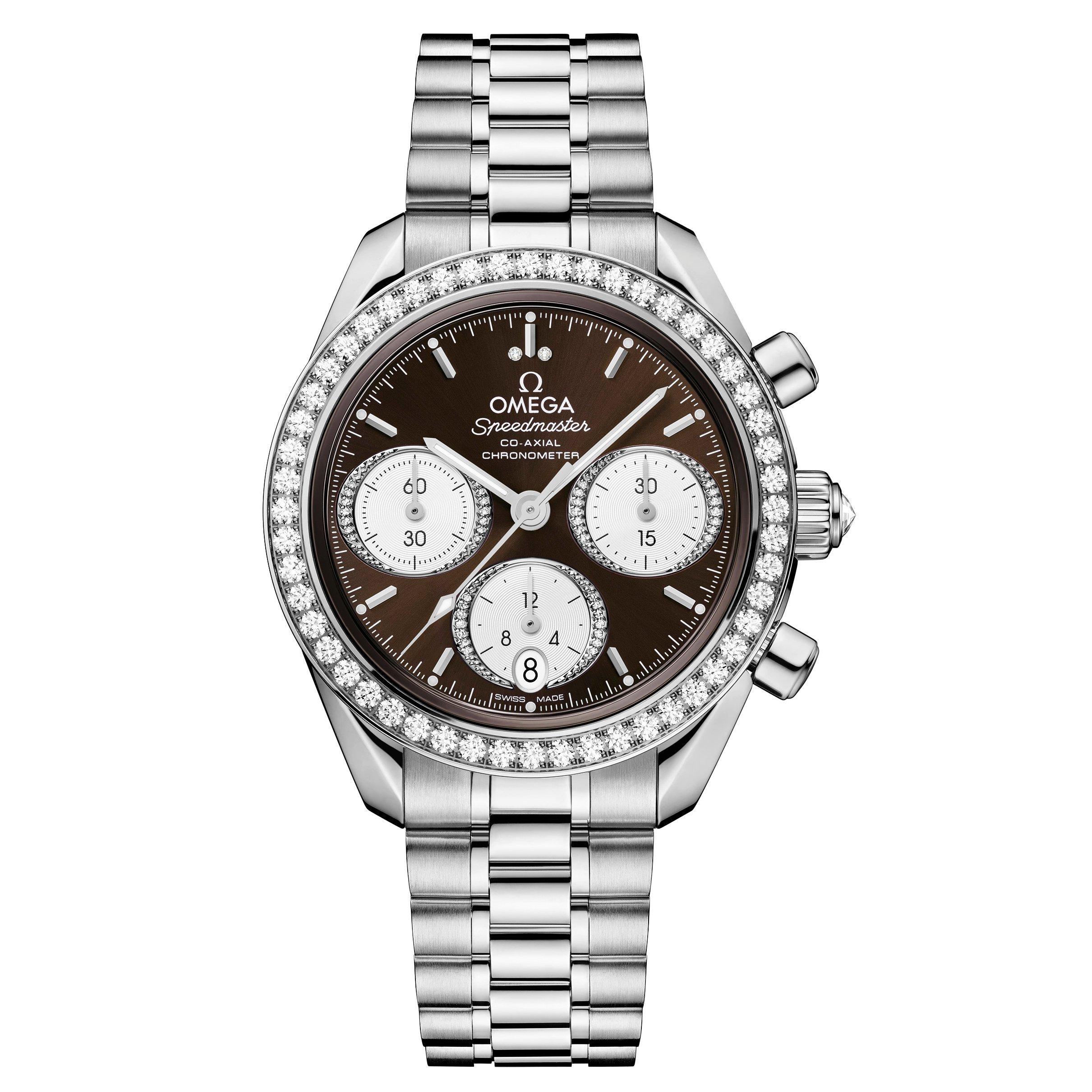 Discover the perfect fusion of luxury and performance with this Omega Speedmaster 38mm Diamond Chronograph Automatic Ladies Watch. A timepiece that redefines sophistication, capturing attention with its refined sparkle and iconic design. Embrace a legacy of excellence with this symbol of elegance. At A Glance Presented on a polished and brushed stainless steel bracelet and fastened with a foldover clasp with OMEGA’s patented comfort release adjust system 38mm stainless steel case with 100m water resistance Bezel set with 52 diamonds, and a polished crown set with a single diamond Screw-in caseback stamped with a Seahorse medallion Brown PVD dial with diamond-polished rhodium plated hour and minute hands, filled with white Super-LumiNova which emits a green glow Horizontal oval subdials with silvery coating and a vertical oval date window displayed at 6 o’clock Scratch-resistant sapphire crystal glass with anti-reflective treatment on both sides Powered by OMEGA Co-Axial Calibre 3330