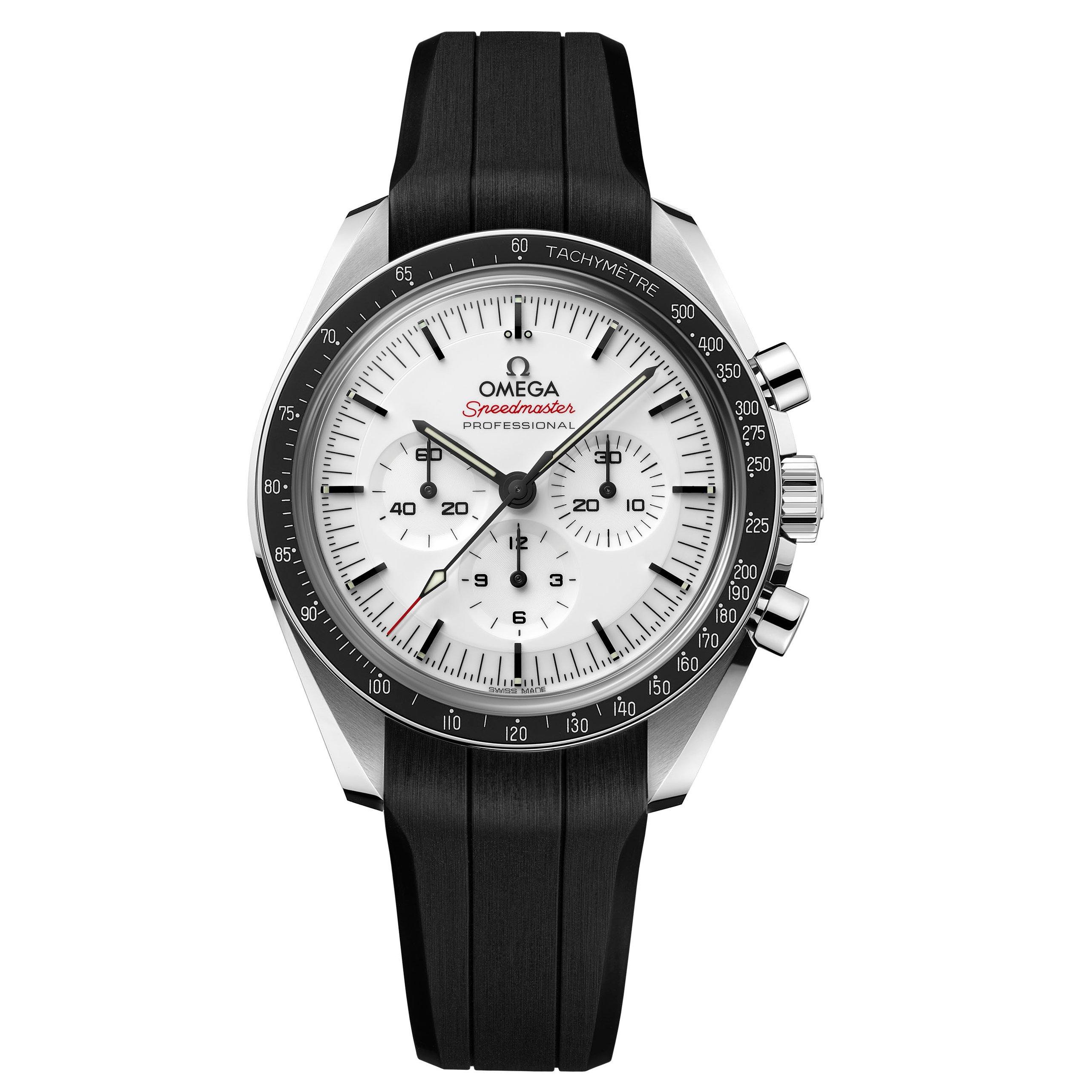 Having been a part of all six moon landings, this Omega Speedmaster Moonwatch Professional 42 Chronograph Watch stands as an iconic symbol of the brand’s immense pioneering history and adventurer spirit. Showcasing exceptional design elements that have taken inspiration from the 4th generation Seamaster and obtaining unparalleled craftsmanship, this timepiece will always stand the test of time and should be treasured for a lifetime. At A Glance Presented on a black rubber strap fastened with a fold-over clasp 42mm stainless steel case with 50m water resistance White dial with applied hands and hour markers Scratch resistant sapphire crystal glass with anti-reflective treatment on both sides Chronograph function Powered by the OMEGA Co-Axial Master Chronometer Calibre 3861 movement Power reserve up to 50 hours