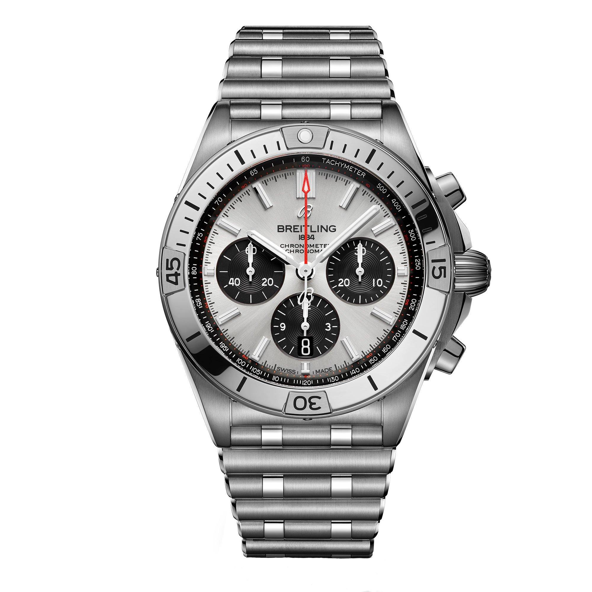 Inspired by the 1983 watch launched in collaboration with the famed Italian aerial squadron, this Breitling Chronomat B01 42 Chronograph Men’s Watch is based on the Frecce Tricolori chronograph and an all-purpose timepiece for your every pursuit. At A Glance Presented on a stainless steel Rouleaux bracelet 42mm case size with 200m water resistance Silver dial with black chronograph sub dials Baton hour markers with date window at 6 o’clock Iconic bezel with the four rider tabs Screw-locked crown with two gaskets Cambered sapphire glass, glareproofed both sides Powered by the self-winding mechanical Breitling 01 movement Power reserve of 70 hours COSC-certified chronometer