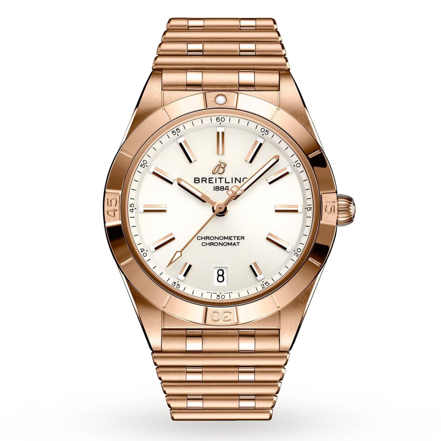 Stylish yet elegant, this Breitling Chronomat Automatic 36mm 18ct Rose Gold Ladies Watch reveals a modern-retro inspired design perfect for every occasion. Sporty and chic, this timepiece has been expertly crafted in 18ct rose gold, showcasing ultimate luxury and incredible craftmanship to, this watch is one to treasure forever. At A Glance Presented on an 18ct rose gold bracelet and finished with a foldover clasp 36mm case with 100m water resistance White dial with rose gold hands and hour markers Date window displayed at 6 o’clock Sapphire crystal glass Powered by an automatic movement
