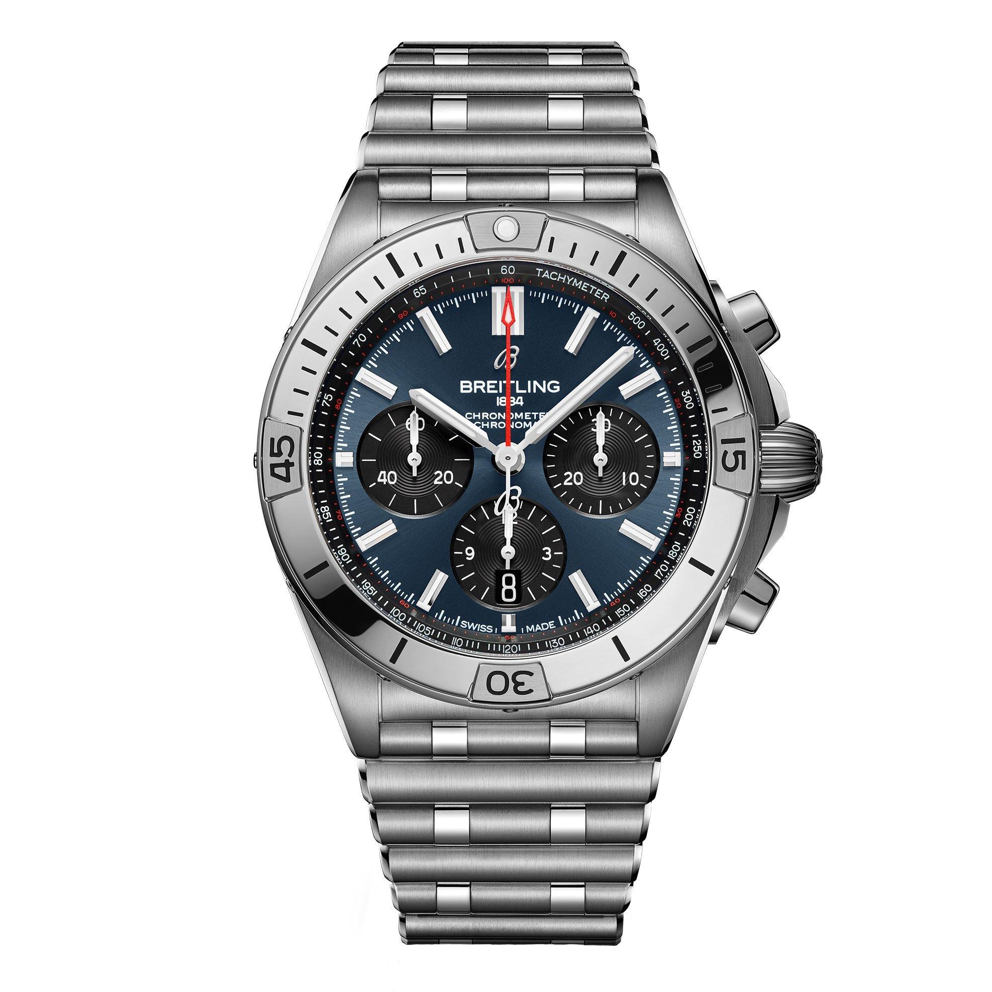 Based on the Frecce Tricolori chronograph from 1983, this Breitling Chronomat B01 42 Chronograph Men’s Watch is an all-purpose watch for your every pursuit. The Chronomat celebrated Breitling’s centenary in style and marked the return of the mechanical chronograph. At A Glance Presented on a stainless steel Rouleaux bracelet 42mm case size with 200m water resistance Blue dial with black chronograph sub dials Baton hour markers with date window at 6 o’clock Iconic bezel with the four rider tabs Screw-locked crown with two gaskets Cambered sapphire glass, glareproofed both sides Powered by the self-winding mechanical Breitling 01 movement Power reserve of 70 hours COSC-certified chronometer