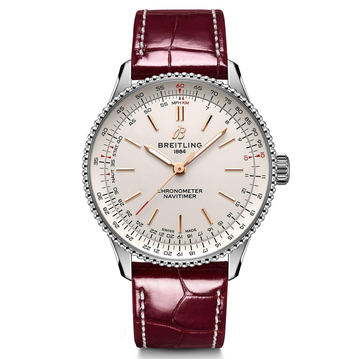 Combining the iconic heritage of the original with a new showstopping design, this Breitling Navitimer 36 Stainless Steel Automatic Ladies Watch reveals the refined elegance and timeless sophistication the Navitimer collection is known for. Offering flawless style and exeptional accuracy, this precious design will complement your luxurious style. At A Glance Presented on an alligator leather strap and finished with a foldover clasp 36mm case with 30m water resistance Silver dial with 18ct rose gold hands and hour markers Sapphire crystal glass Powered by the COSC-certified Breitling Caliber 17, providing three-hand time and automatic winding