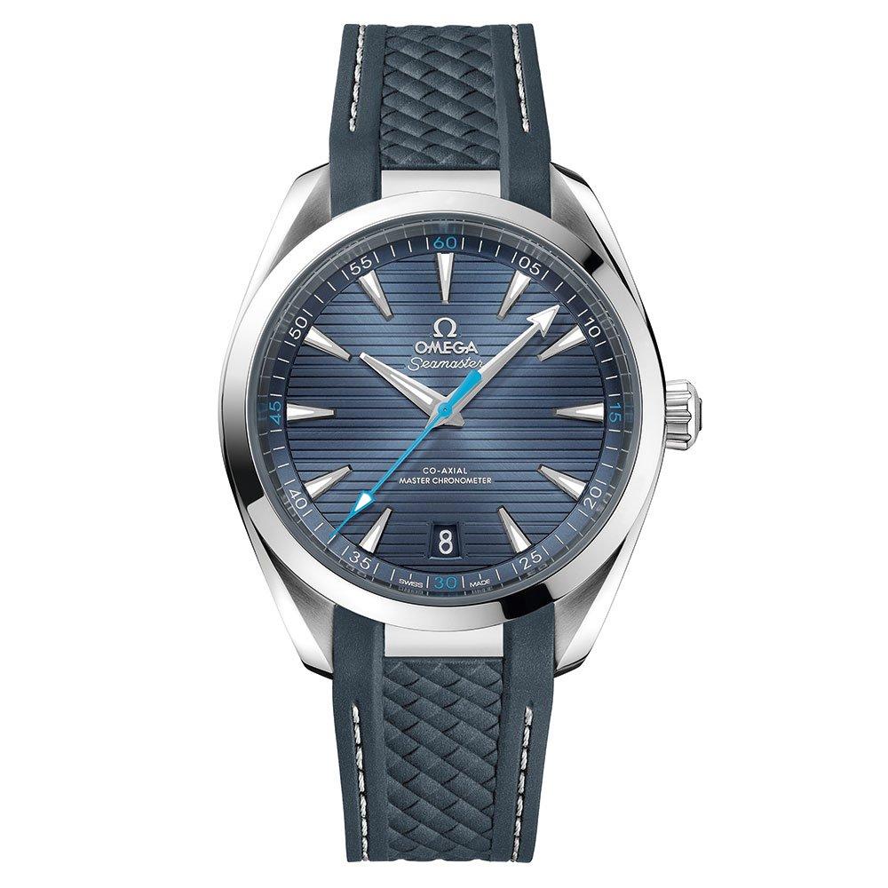 Showcasing exquisite Swiss craftsmanship and outstanding performance, this OMEGA Seamaster AquaTerra Automatic Chronometer Men’s Watch is powered by an extremely precise Master Chronometer automatic movement. The stunning blue dial is perfectly suited to ocean adventurers. At A Glance Fastened with a grey rubber strap 41mm stainless steel case with a polished bezel and 150m water resistance Scratch-resistant sapphire crystal Blue dial with horizontal stripes and baton hour markers Date window at 6 o’clock Powered by the OMEGA Co-Axial Calibre 8900 Master Chronometer self-winding automatic movement Minimum power reserve of 60 hours