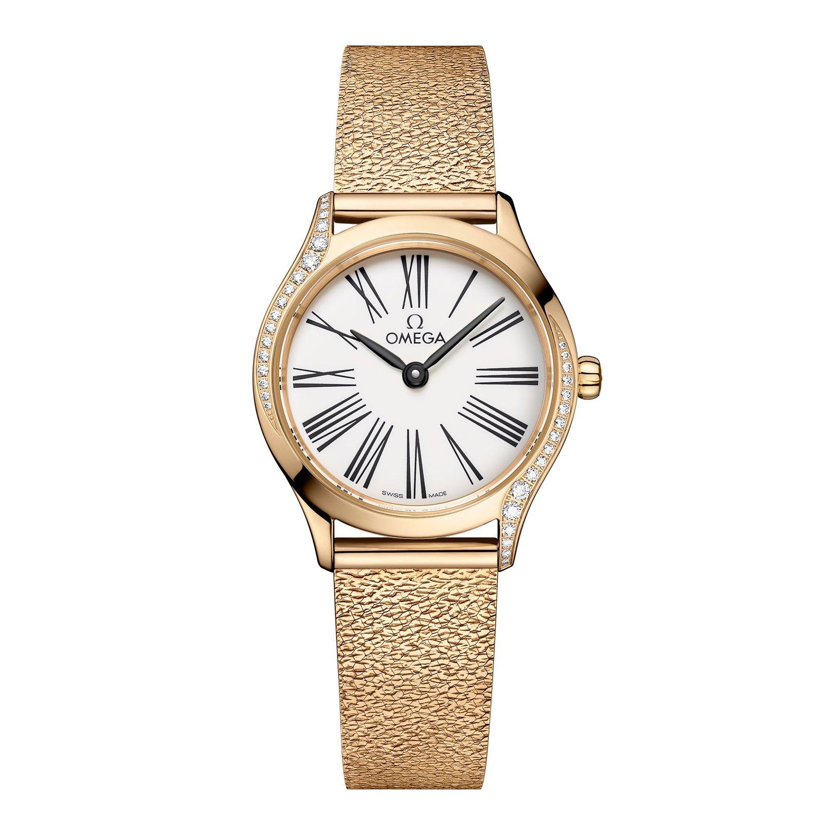 A refined and contemporary take on this classic ladies collection, this OMEGA De Ville Mini Tresor Quartz Ladies Watch is a sumptuous and elegant statement, perfect for those who have a passion for exquisite design and exceptional quality. At A Glance Presented on a Moonshinetm gold mesh bracelet 26mm Moonshinetm gold case with a 30m water resistance Off-white ‘Grand feu’ enamel dial with black hands and Roman numeral hour markers Bezel embellished with diamonds Domed scratch resistant sapphire crystal glass with anti-reflective coating on the inside Powered by OMEGA Calibre 4061 movement Battery life up to 48 months