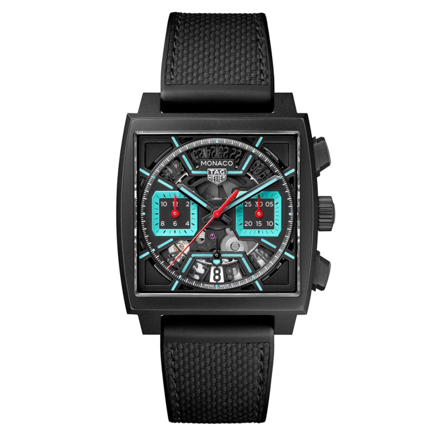 This TAG Heuer Monaco 39mm Titanium Chronograph Automatic Men’s Watch is an eye-catching icon. Built with a sandblasted black skeletonised dial, enhanced with luminous turquoise highlights and vibrant red lacquered hands. Powered by the technical Calibre Heuer 02, this timepiece ensures precision within a fierce design. At A Glance Presented on a rubber and leather strap and finished with a foldover clasp 39mm case with 100m water resistance Sandblasted black skeletonised dial with luminous turquoise highlights and vibrant red lacquered hands Date window displayed at 6 o’clock Sapphire crystal glass Powered by an automatic movement