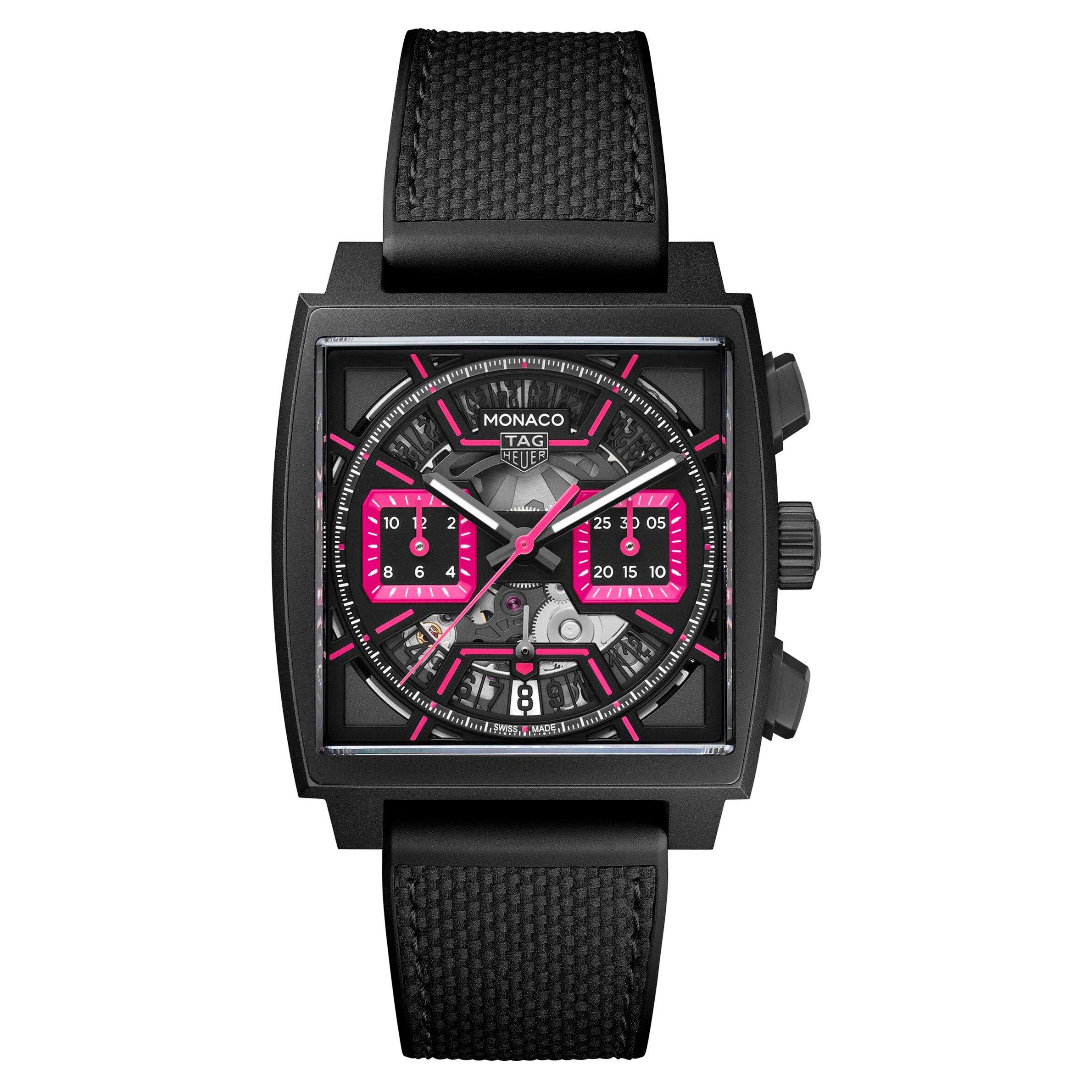 Making a bold statement of modern luxury, this TAG Heuer Monaco 39mm Chronograph Automatic Mens Watch effortlessly combines contemporary design with watchmaking excellency. Meticulously crafted with exceptional movement and precision, a striking skeleton dial with pink accents and refined materials, this timepiece is destined to be treasured for years to come. At A Glance Presented on a black calf skin and rubber strap fastened with a titanium folding clasp with push-buttons 39mm black DLC titanium grade 2 sand-blasted square case with 100m water resistance Black sand-blasted dial with black gold plated facetted hands, pink lacquered central hand filled with Super-LumiNova Chronograph function Scratch resistant sapphire crystal glass Powered by an automatic movement – calibre TH20-00